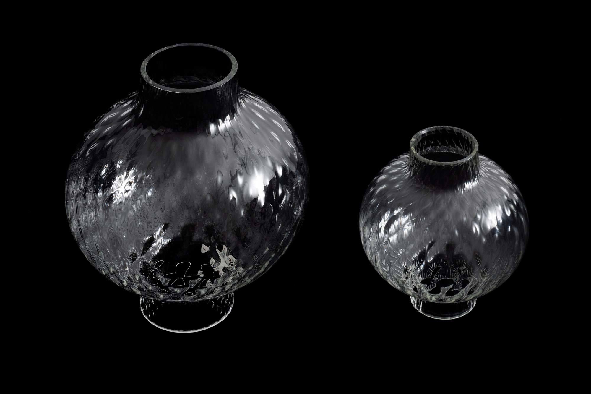 Im Zentrum jeder Alambicco-Leuchte – ob als Pendel- oder Stehversion – befindet sich eine filigrane Aluminiumstruktur, die LEDs auf mehreren Seiten trägt. Um dieses technische Herz gruppieren sich kunstvolle Glaselemente: Ein erster, geriffelter Zylinder schirmt die Lichtquelle ab und schützt vor Blendung, während eine zweite, mundgeblasene und abgerundete Schicht das Licht gleichmäßig streut und ihm eine sanfte, fast poetische Qualität verleiht.