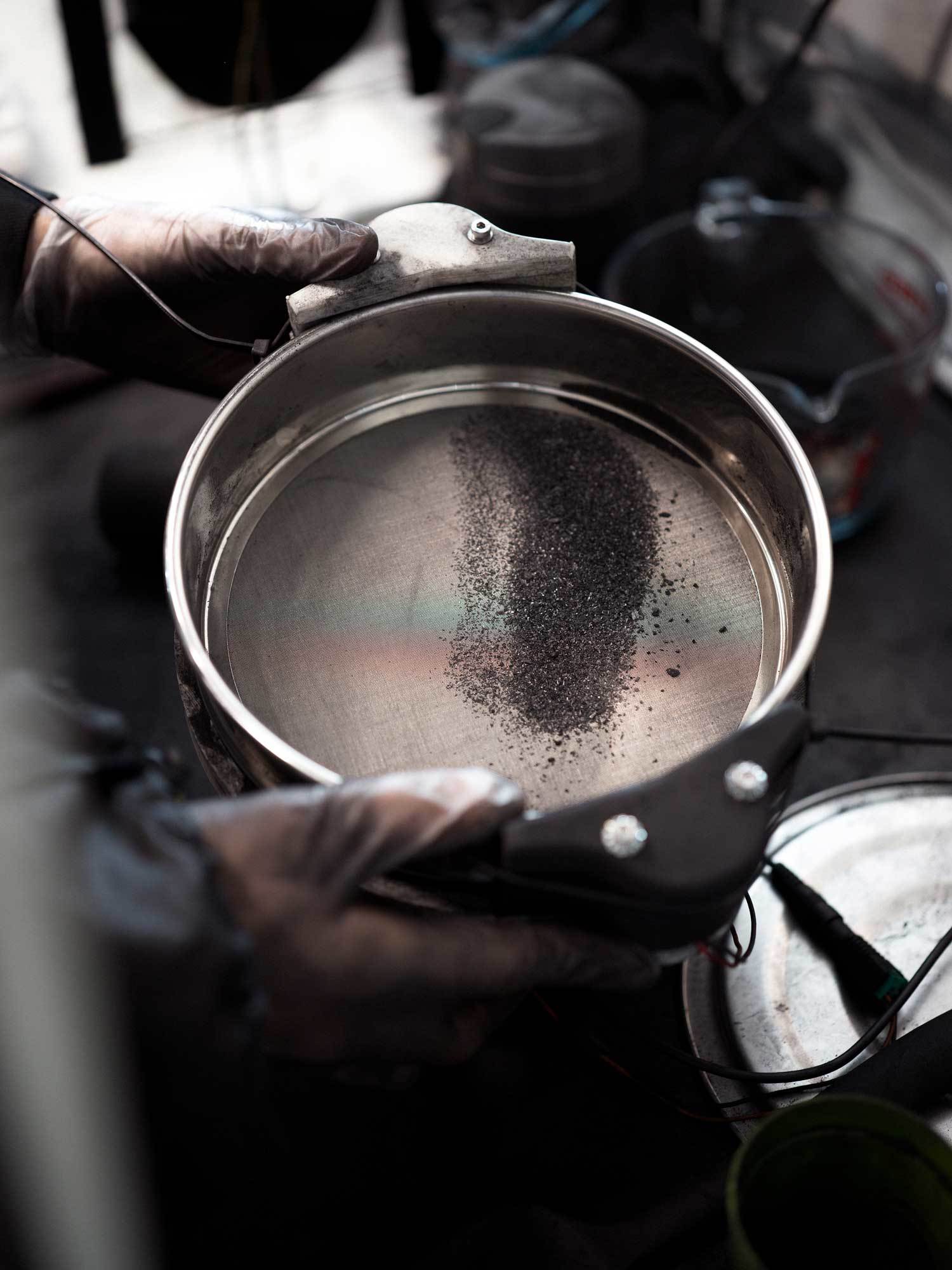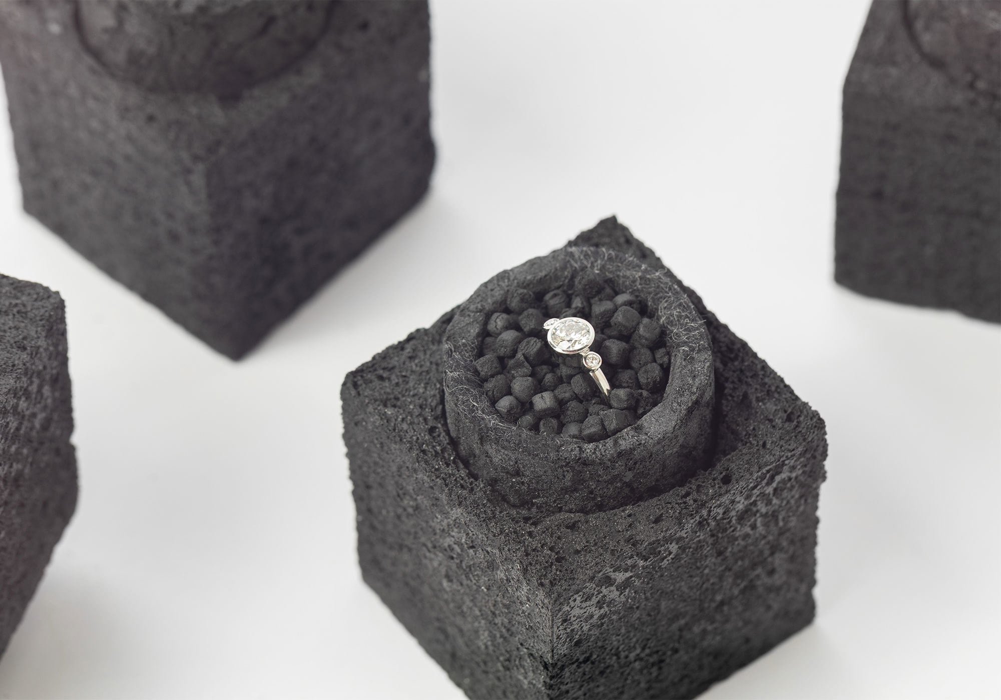 Das Material ist schwarz. Die Farbe ist kein Zufall, sondern „erzählt“ den Ursprung aus Kohlenstoff. Sie unterscheidet sich klar von den bekannten weißen Verpackungsschäumen. Die ungewohnte, fast vulkanische Haptik bietet viele ästhetische Anwendungsmöglichkeiten.