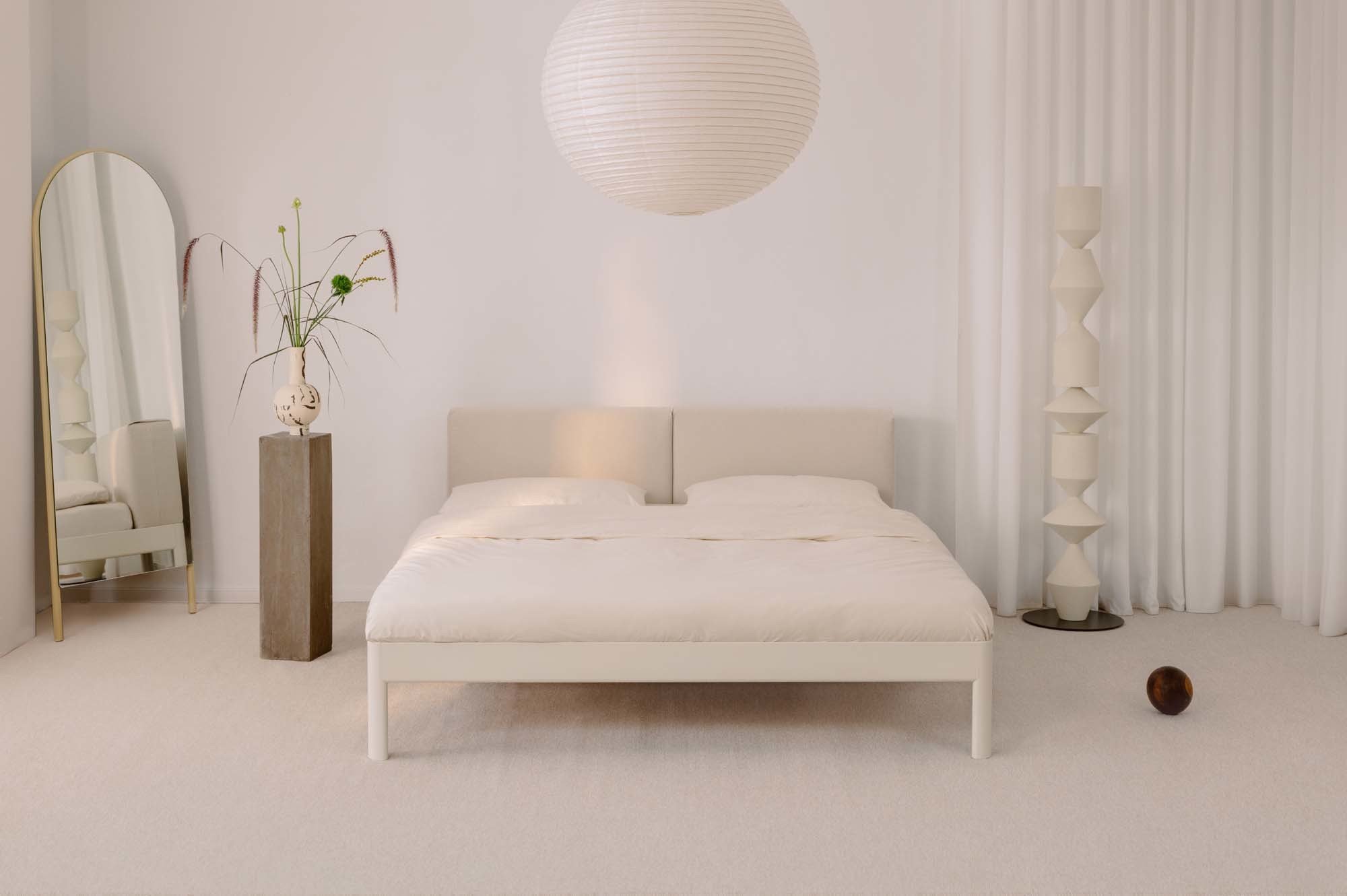 Ein Bett, das Ruhe bewahrt – klar konstruiert und langlebig gedacht. Heia von Noah steht fest im Raum, mit reduzierter Formensprache, stabiler Struktur und durchdachter Funktion. Der Rahmen besteht aus recyceltem, pulverbeschichtetem Aluminium. Das Kopfteil wird aus naturbelassener Baumwolle und Leinen gefertigt. Die Bezüge lassen sich abnehmen und per Hand waschen. Die Materialien sind hochwertig, die Verarbeitung präzise. Heia bleibt dauerhaft geräuschlos, belastbar und gepflegt.