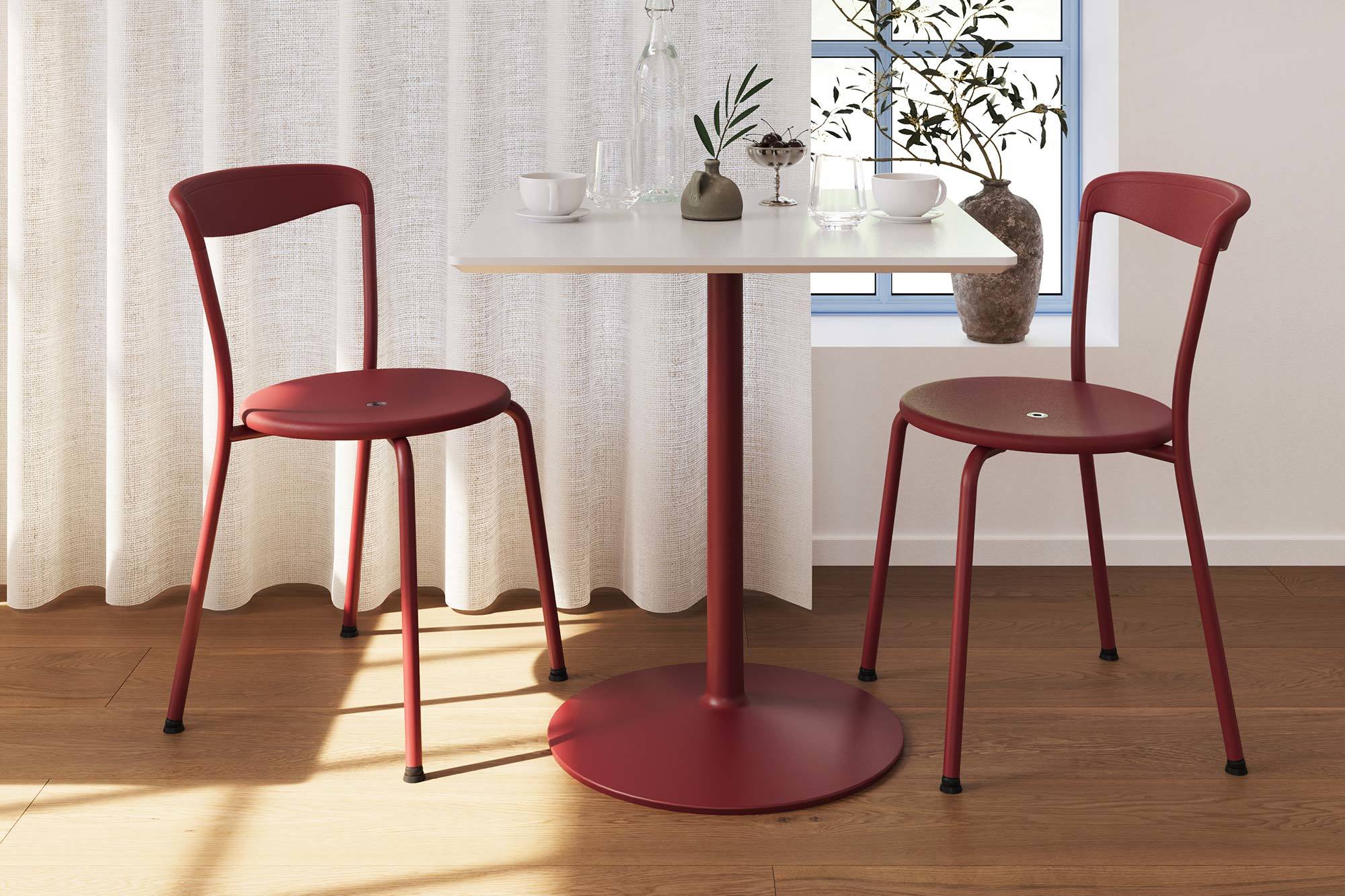 Um der Witterung auf Terrassen und Balkonen standzuhalten, wurde das Stahlgestell elektroverzinkt und mit einer fein texturierten, widerstandsfähigen Pulverbeschichtung versehen. Sitz und Rückenlehne bestehen aus 100 Prozent recyceltem Polypropylen und können vollständig wiederverwendet werden. Im Sitz integriert ist eine Abflussvorrichtung aus eloxiertem Aluminium, die Wasser gezielt ableitet.