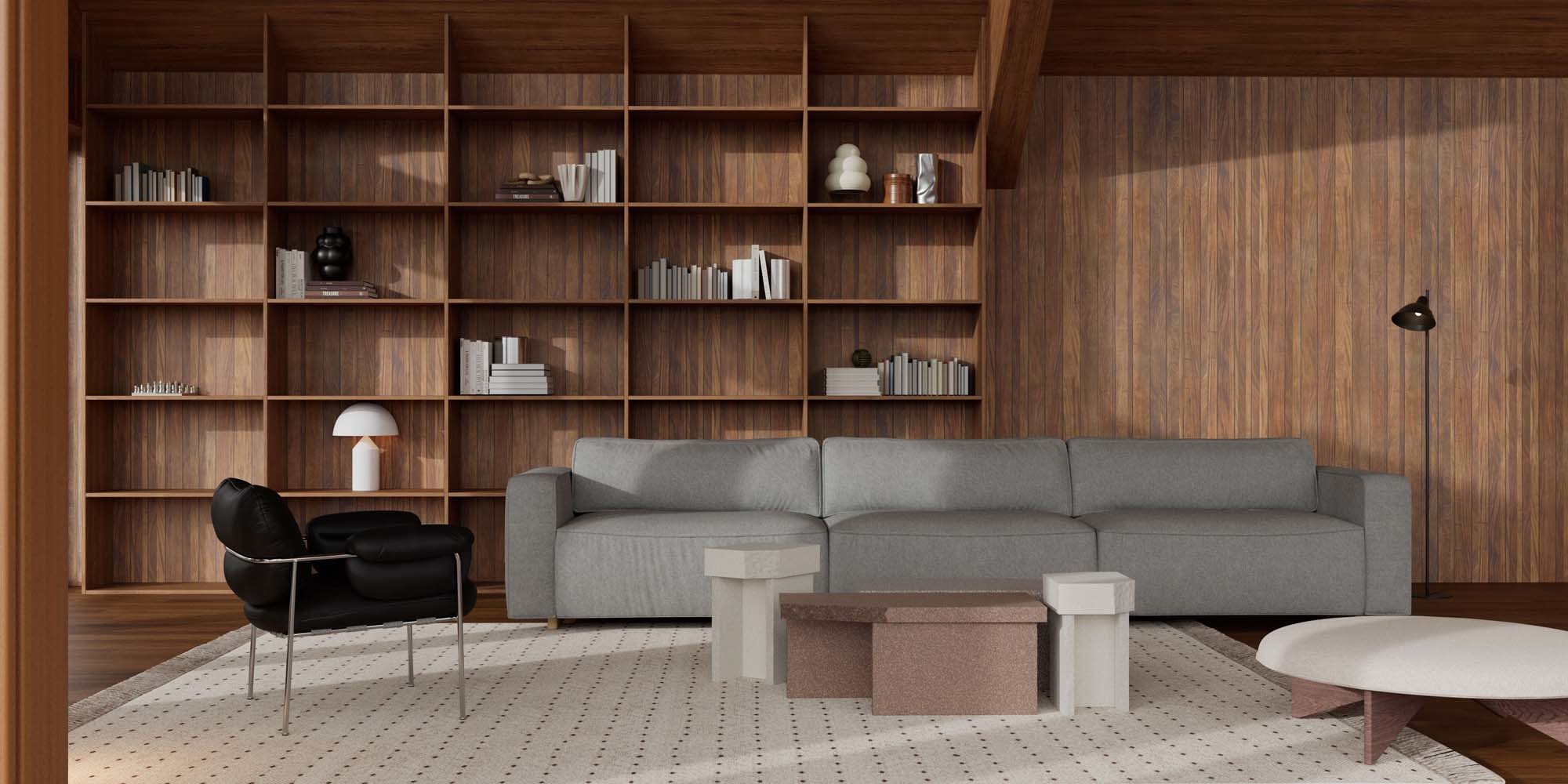 Das neuartige Material, aus dem die Kollektion gefertigt wird, heißt OUTT. Es besteht zu 85 Prozent aus Marmorabfällen, ergänzt durch Marmorstaub und Zement. Die Oberfläche bleibt bewusst unregelmäßig. Statt Glanz gibt es Struktur. Statt Dekor wirkt die Massivität. Das Ergebnis erscheint rau, erdig, eigenständig. Fogia ist die erste Marke, die OUTT für Möbel nutzt. Die Produktion erfolgt in Italien, auf Grundlage eines patentierten Verfahrens, das an die Terrazzoherstellung anknüpft. sr