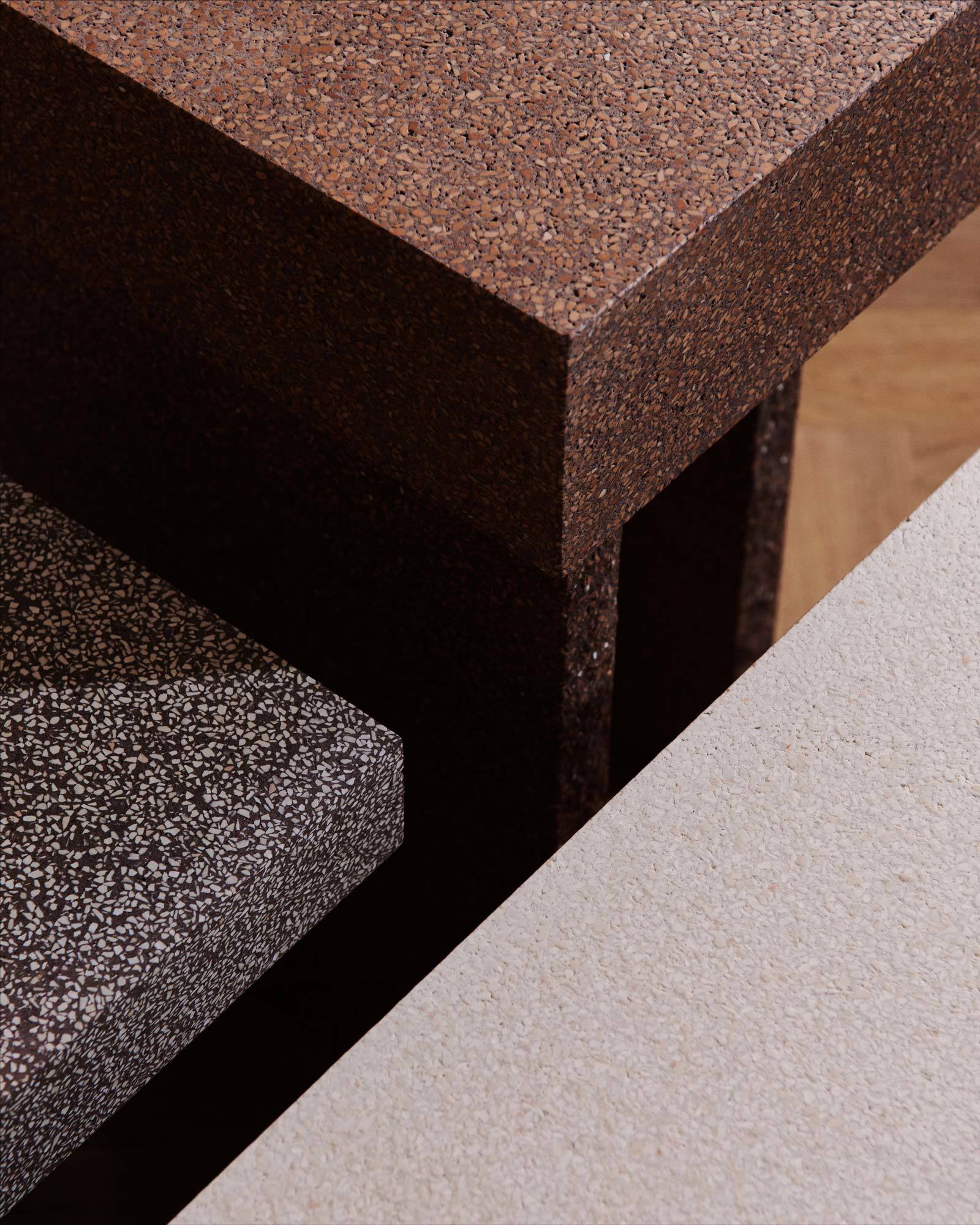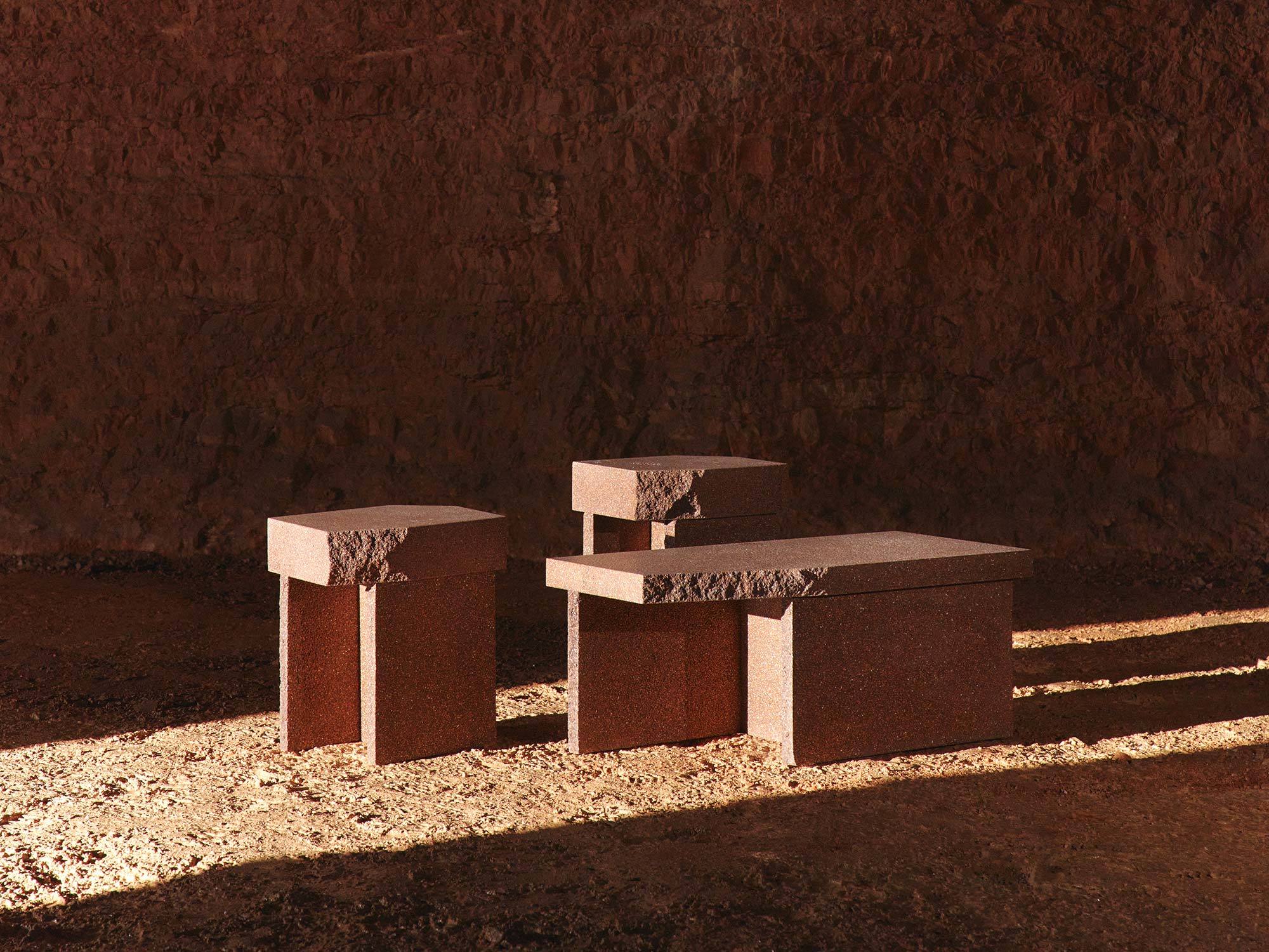 Die Möbel lassen sich in Höhe, Format und Kombination variieren. Ihre asymmetrischen Konturen, das gebrochene Volumen und die markante Materialität erzeugen eine physische Präsenz, die sich für den Innen- und Außenbereich bestens eignet. Die Idee entstand aus dem Material. Monica Förster erkannte das Potenzial einer Musterplatte mit abgebrochenen Ecken und machte diesen Zufall zum Prinzip. Jede Ecke wird per Hand gebrochen, kein Tisch ist identisch. Daraus ergibt sich eine Serie, die wie eine Reihe von Einzelstücken wirkt.