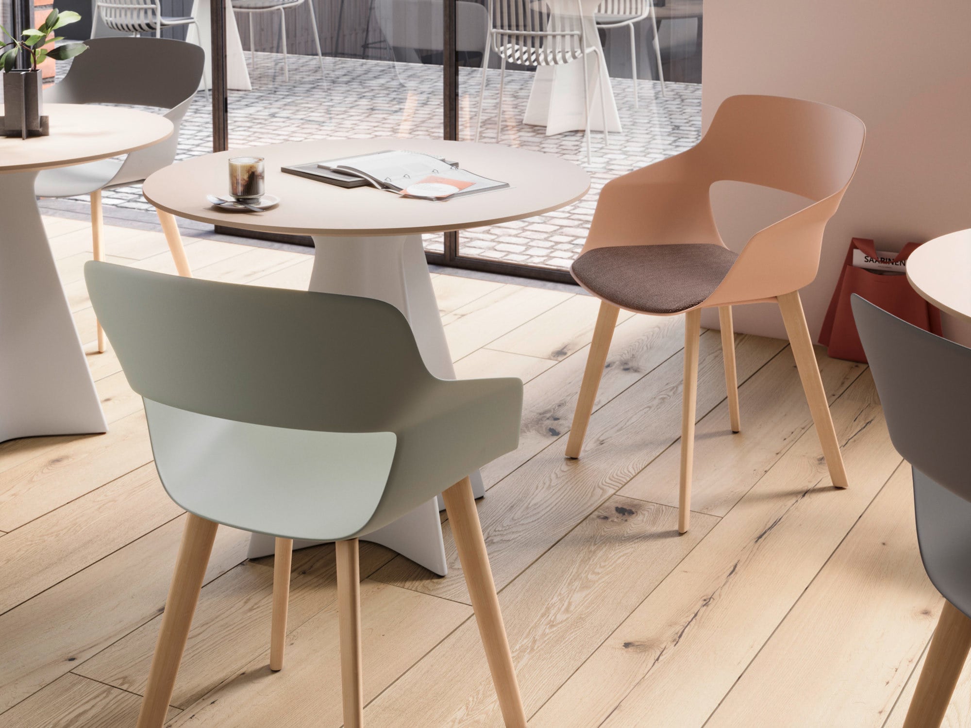 Zirkuläres Design ist hier kein Zusatz, sondern der Ausgangspunkt. scoop verbindet ästhetische Klarheit mit ökologischer Verantwortung. Die Sitzschale besteht in allen acht Farben optional aus hochwertigem Recyclingkunststoff, wodurch der CO2-Fußabdruck reduziert wird. Für das Gestell stehen zwei Materialien zur Wahl: langlebiger Stahl oder Holz aus zertifizierter Forstwirtschaft. Diese Offenheit schafft nicht nur gestalterische Freiheit, sondern fördert auch eine ressourcenschonende, dauerhafte Nutzung. Mit drei Polsterstufen – ungepolstert, Sitzpolster oder Sitz- und Rückenpolster – lässt sich scoop flexibel an Funktion und Nutzungsintensität anpassen.