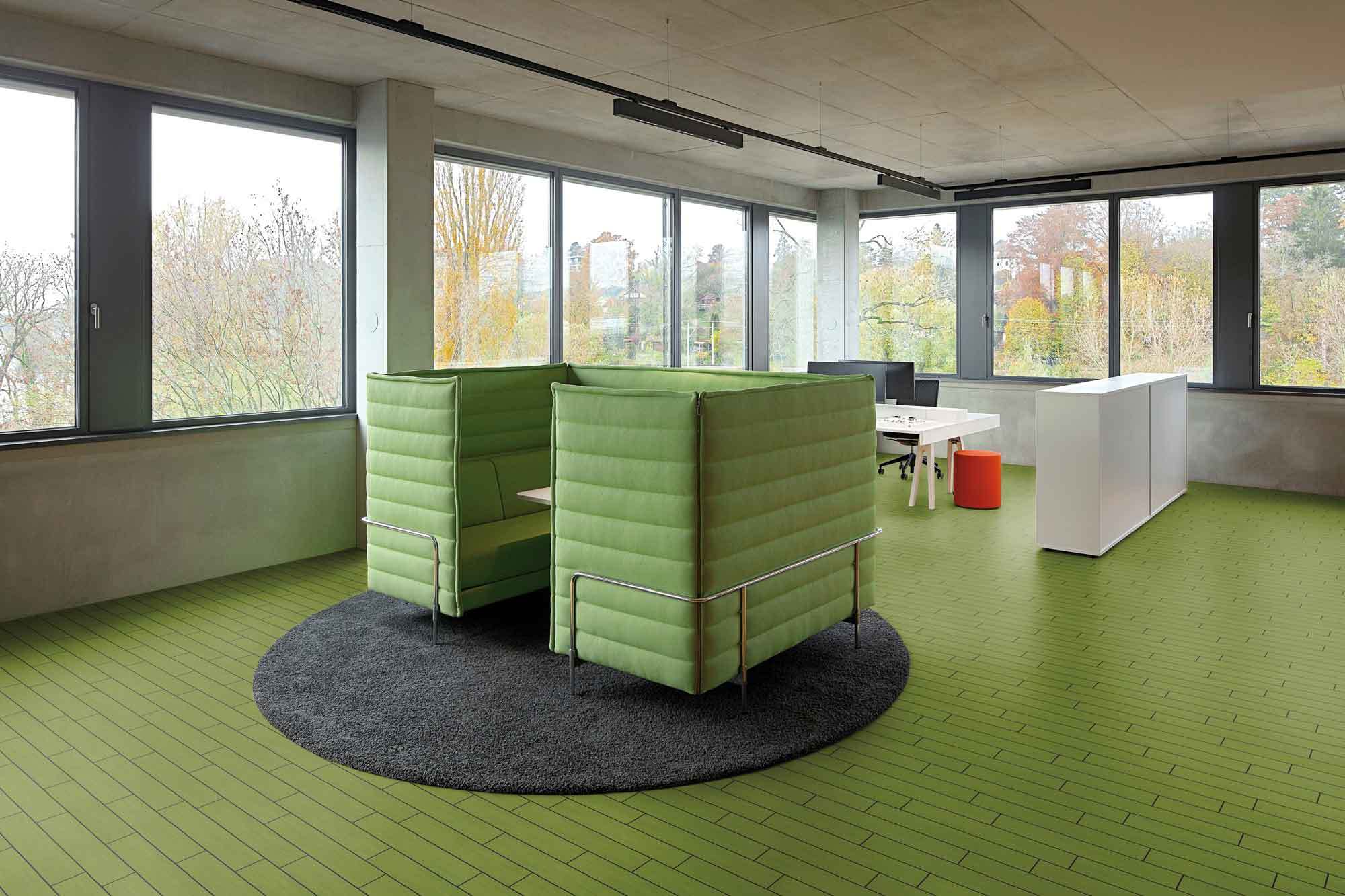 Mit UNIQUE DESIGN eröffnet Project Floors Architekt*innen neue Freiheiten in der Raumgestaltung. Die Kollektion verabschiedet sich bewusst von klassischen Holz- und Steininterpretationen und setzt auf abstrakte Muster, gewebte Strukturen sowie kraftvolle Farben. Moosgrün, Gelb oder Saphirblau bringen Stimmung in Wohn- und Arbeitsräume und laden dazu ein, jedem Projekt eine eigene Identität zu verleihen. Auffällige Verlegemuster wie Fischgrät in Gras- oder Zebranooptik verwandeln den Boden in eine kreative Fläche, die weit über die traditionelle Funktion hinausgeht.
