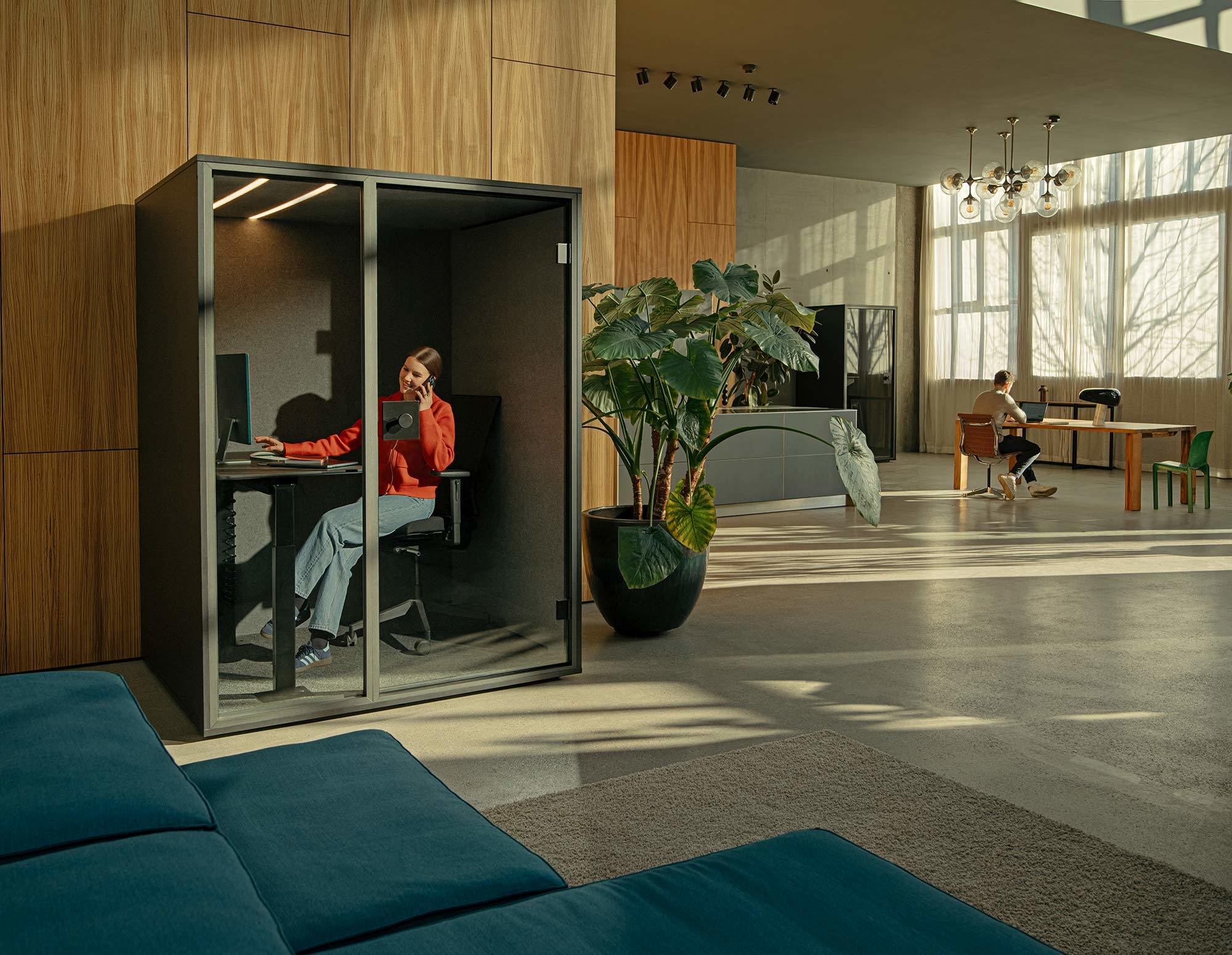 Ein geschlossener Raum für klare Gedanken: Die WORK-Kabine von Berlin Acoustics schafft einen Ort für ungestörte Einzelarbeit und wurde konzipiert für längere Konzentrationsphasen in dynamischen Büroumgebungen. Sie richtet sich an Mitarbeitende, die Ruhe und Privatsphäre brauchen, ohne sich komplett aus dem Arbeitsgeschehen zurückzuziehen. Im Unterschied zur kleineren Kabine Focus, die für Telefonate oder ein kürzeres fokussiertes Arbeiten gedacht ist, bietet die Mini-Office-Lösung WORK deutlich mehr Komfort, Ausstattung und Flexibilität für eine ganztägige Nutzung.