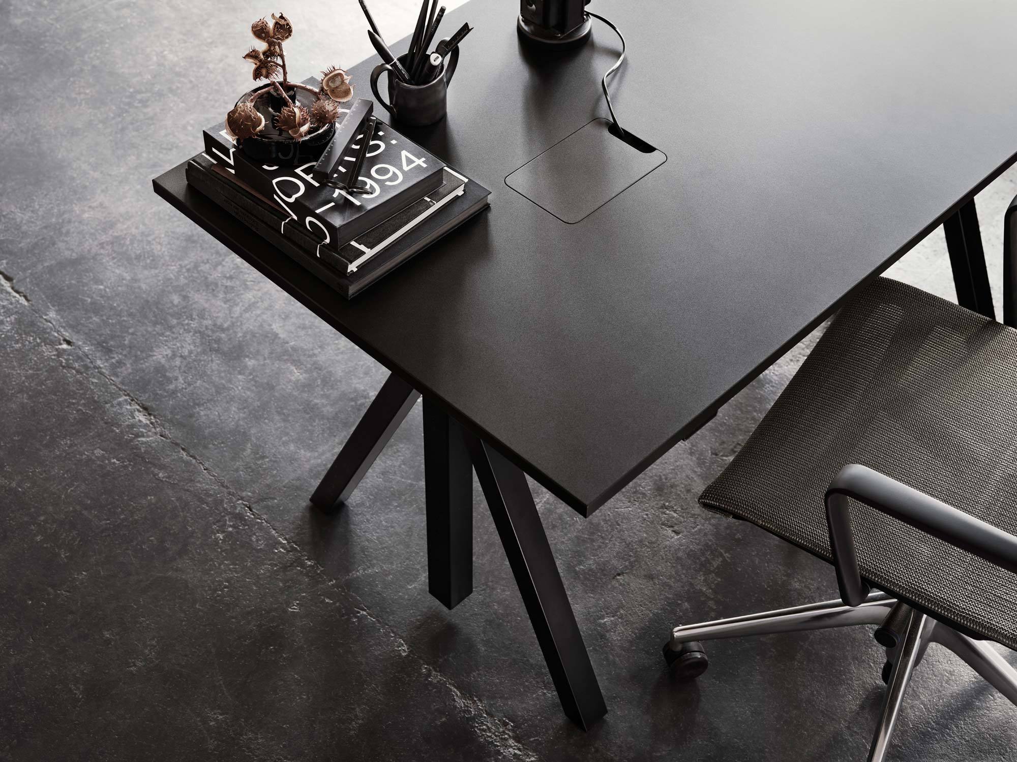 Works umfasst unterschiedliche Tischgestelle, die auf verschiedene Arbeitssituationen zugeschnitten sind. Wahlweise stehen feste oder elektrisch höhenverstellbare Varianten zur Verfügung: Die elektrische Version bietet eine Höhe von 71,5 bis 118,5 Zentimetern, während die feste Ausführung eine Standardhöhe von 72,5 Zentimetern hat, die sich um einen Zentimeter justieren lässt. Die Tischplatten sind in fünf Breiten von 120 bis 360 Zentimetern erhältlich und decken damit das gesamte Spektrum moderner Arbeitsbereiche ab. Mit 78 Zentimeter Tiefe eignen sie sich besonders gut für kompakte Einzelarbeitsplätze, mit 90 Zentimetern sind sie ideal für Besprechungs- und Konferenzräume. Alle Varianten verfügen über einen integrierten Deckel zur Kabelführung.