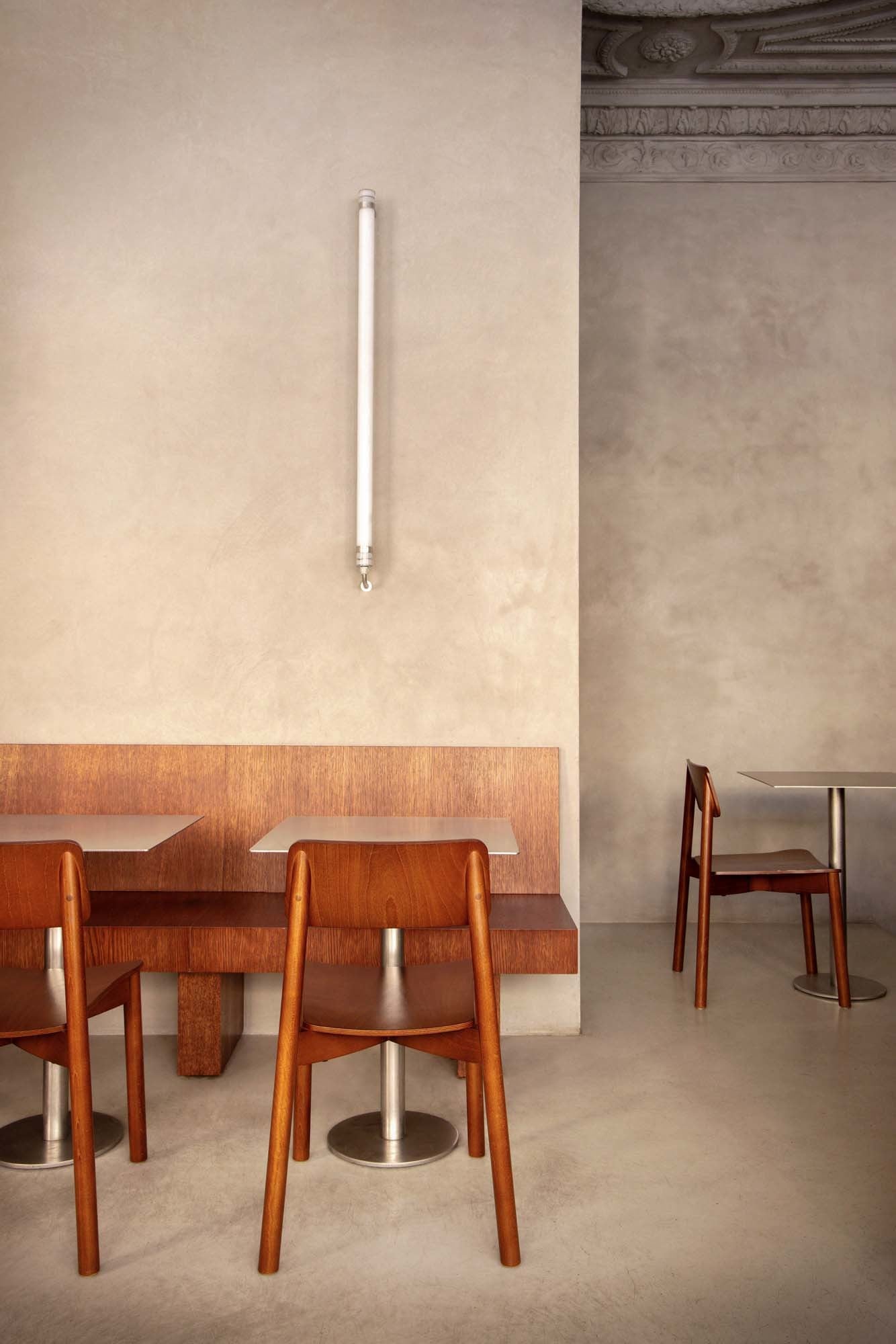 So erhielt die charakteristische Außenfassade mit ihrer lang gestreckten Fensterfront lediglich einen neuen Farbanstrich, während im Innenraum die originale Stuckdecke mit ihrer reichen Ornamentik sorgfältig restauriert wurde. Dieses architektonische Erbe ergänzten die Planer*innen durch mineralischen Kalkputz, der den Wänden Tiefe und eine feine Textur verleiht, sowie einen Boden aus poliertem Beton, der das Interieur ruhig und zeitgemäß erdet. Reflektierende Spiegelelemente vergrößern den Raum optisch und zitieren die Tradition Pariser Bistros, während vertikale industrielle Lichtrohre und schwebende lineare Leuchten im Innenraum mit seinen 24 Sitzplätzen eine klare, zeitgenössische Handschrift erkennen lassen.
