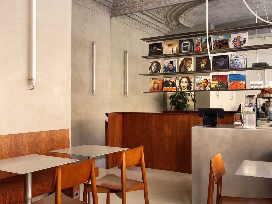 Im hinteren Bereich des Raums setzte das Team von OUI mit einem schwebenden Vinylregal zudem einen interessanten erzählerischen Akzent: Eine kuratierte Musikauswahl – von Fela Kuti bis Sade – unterstreicht das subtile Konzept, das sowohl Tourist*innen als auch Einheimischen einen lässigen Ort zum Verweilen bietet.
