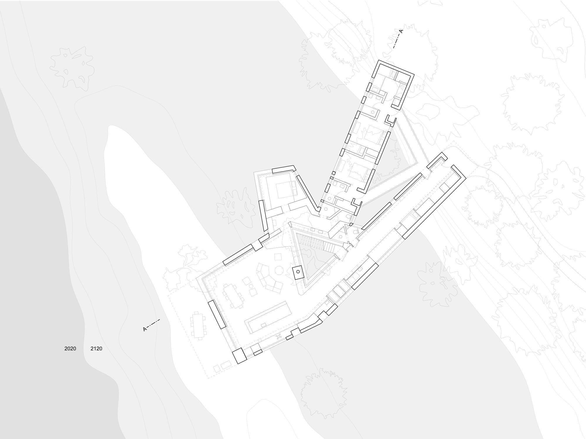 Das restliche Haus ist inklusive des Flurs in drei Trakte aufgeteilt, die wie drei Bänder strahlenförmig vom Hauptraum abgehen. Der kürzeste Flügel beherbergt das Hauptschlafzimmer und die spektakulärste Aussicht. Er schwebt über der Senke und orientiert sich zum Wasser. Das Bett wird zum Beobachtungsposten für Flora und Fauna zwischen Wald und Wasser.