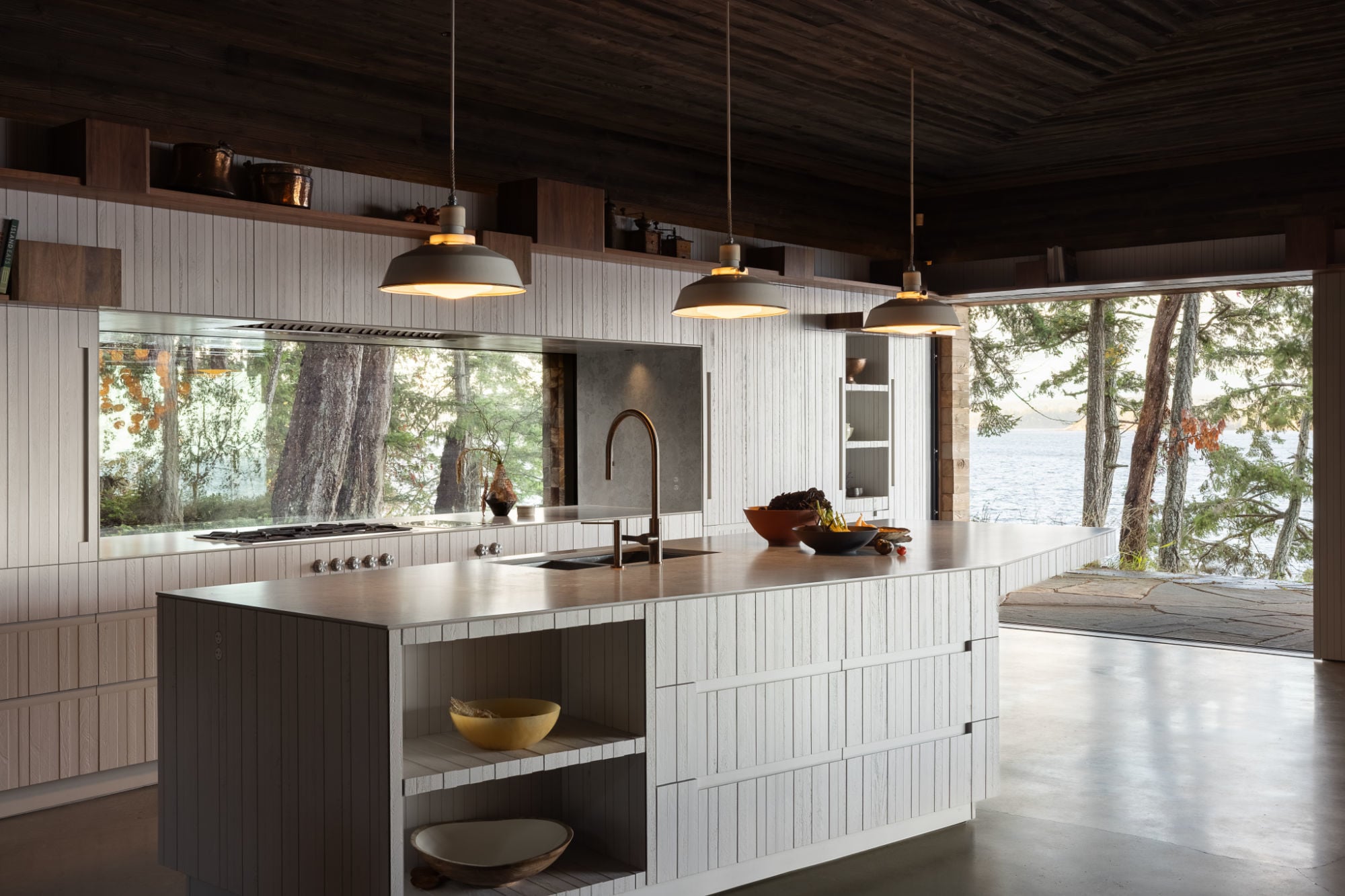 An seiner Südwand sind durchgängig Stauraumeinbauten integriert, die von funktionalen Nischen unterbrochen werden. Arbel beschreibt diese als Stauraum – nicht nur für Dinge, sondern auch für Menschen und Aktivitäten. Als kleine Refugien bieten sie eine Sofaecke, Etagenbetten oder einen Tischplatz, vor allem aber unmittelbare Ausblicke in den Wald durch große Fenster. Hinter dem höhlenartigen Flur öffnet sich der Wohnbereich mit Küche wie eine Lichtung. Bodentiefe Fenster führen auf die Terrasse und zum Meer. Aus der erhöhten Position über dem Strand nimmt der Pazifik einen Großteil des Panoramas ein.