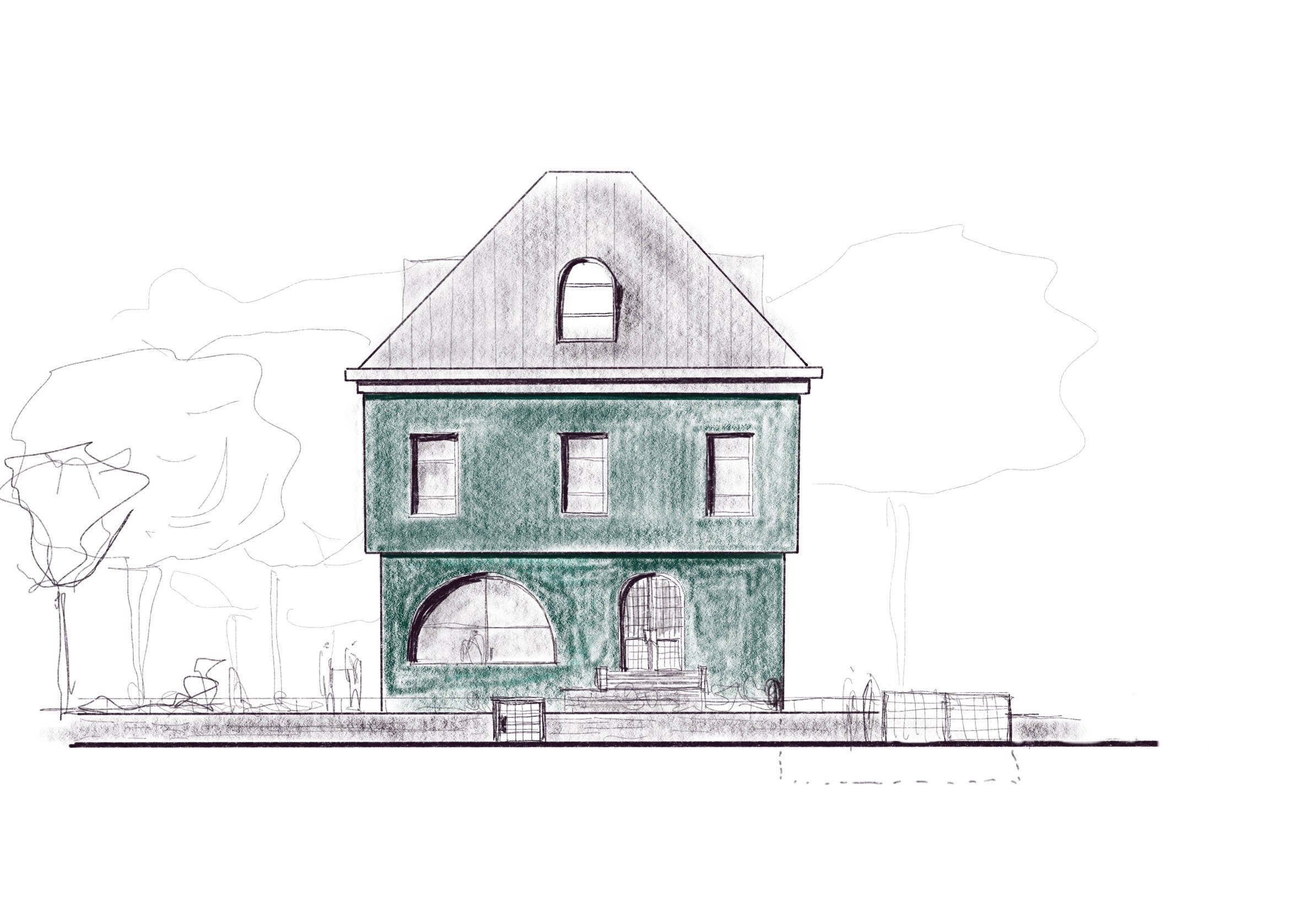 Das Greenkamp ist auffällig unauffällig. Die mit dunkelgrünem, mineralischem Kalk verputzte Fassade und das mit vorpatinierten Keramiksteinen gedeckte Dach fügen sich zurückhaltend zwischen die alten Laubbäume. Die Architektursprache versteht sich als sensibles Echo auf den Bestand: Sie greift die traditionellen Typologien der Siedlung auf und orientiert sich mit ihrem kompakten Volumen und der quadratischen Grundform mit Zeltdach an den Nachbarhäusern. Deren Kubaturen sind einfach und funktional, vermeiden aber sowohl städtebauliche als auch individuelle Monotonie. Eingebettet in die Natur und erschlossen durch leicht geschwungene Straßen, finden sich immer wieder Elemente des Art déco: runde und halbkreisförmige Details oder horizontal angeordnete Rechteckornamente. Beim Greenkamp sind es vor allem die Fenster, die augenzwinkernd mit jeder Gleichförmigkeit brechen. Die Front des von der Straße zurückgesetzten Baus wird durch ein Bogenfenster, ein Bullauge und eine zweiflügelige Rundbogentür mit rautenförmigen Sprossen gegliedert. In der ersten Etage strukturieren hochformatige Fenster das Fassadenbild. Das Dachfenster ist als Aufbau ausgebildet, der an eine kleine Kommandobrücke erinnert.