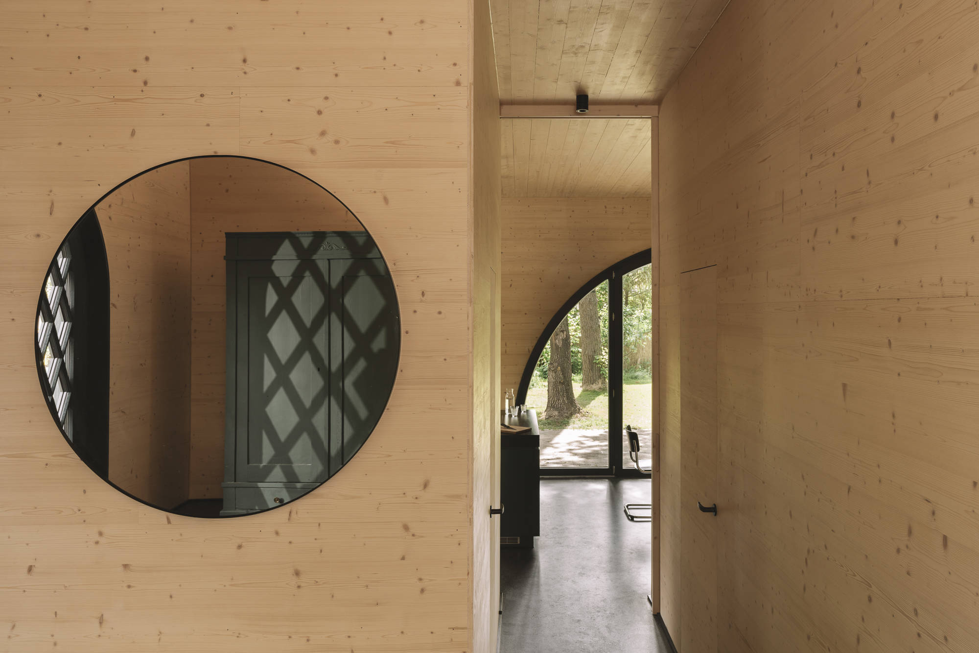 Ein klassisches Foyer empfängt die Besuchenden und führt sie direkt zum Herzstück des Hauses. Über eine halbe Treppe gelangt man hinunter in die Küche mit Essplatz und Gartenanschluss. Von hier geht es wieder hinauf in den eigentlichen Wohnraum. „Salle séparée“ haben ihn die Architekt*innen getauft: Es ist ein Refugium zum Lesen, für Gespräche oder zum Musikhören, das mit Kaminofen und Panoramafenster geradezu zur Kontemplation einlädt. Die beiden darüberliegenden Geschosse – die erste Etage und der Dachboden – beherbergen die privaten Bereiche der Familie: Schlafräume, Spiel- und Kinderzimmer, Arbeitszonen und Bäder. Bei ihrer Gestaltung hat Atelier ST den Rundbogen zu einem durchgängigen Architekturmotiv gemacht. Alle Türen schließen oben mit einem Halbkreisbogen ab, ausgeführt in schwarz gebeizter Eiche. So entsteht trotz des reduzierten Materialeinsatzes ein spannungsvolles Raumgefüge, das über die vielen Fenster auch die Natur des Gartens und des Standorts zu einem lebendigen Bestandteil des Interiors macht.