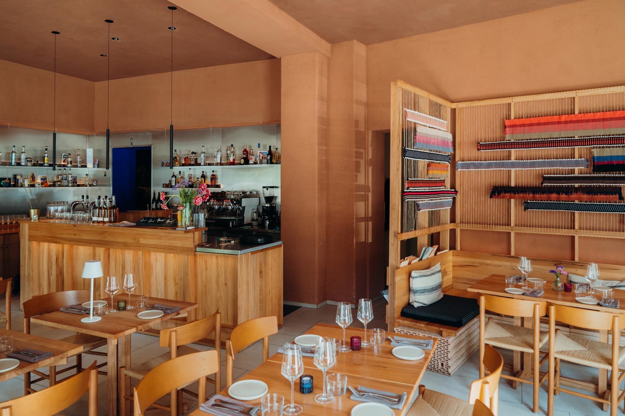 Das haptische Zentrum bildet der Einsatz natürlicher Materialien. In Anlehnung an die traditionellen Lehmbauten Mexikos, die Arriaga an sein Elternhaus erinnern, erhielt der Salón de la amistad einen terrakottafarbenen Lehmputz. Dieser verleiht dem Raum eine archaische Wärme. Einen Kontrast dazu bilden die maßgefertigten Raumteiler aus geölter Kernbuche, die wie traditionelle Webrahmen mit bunten Fäden bespannt sind.
