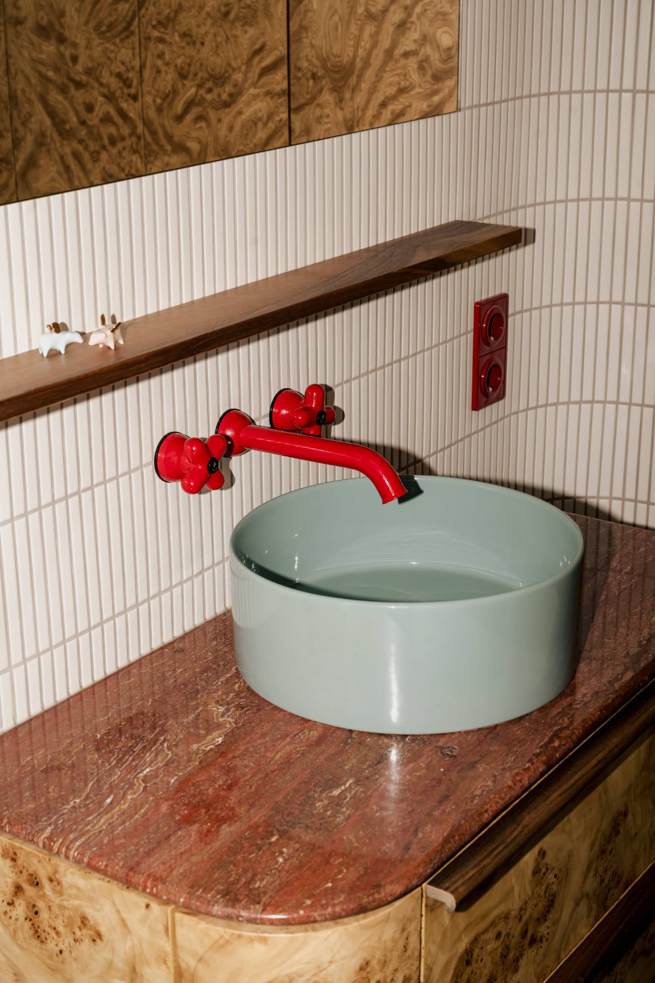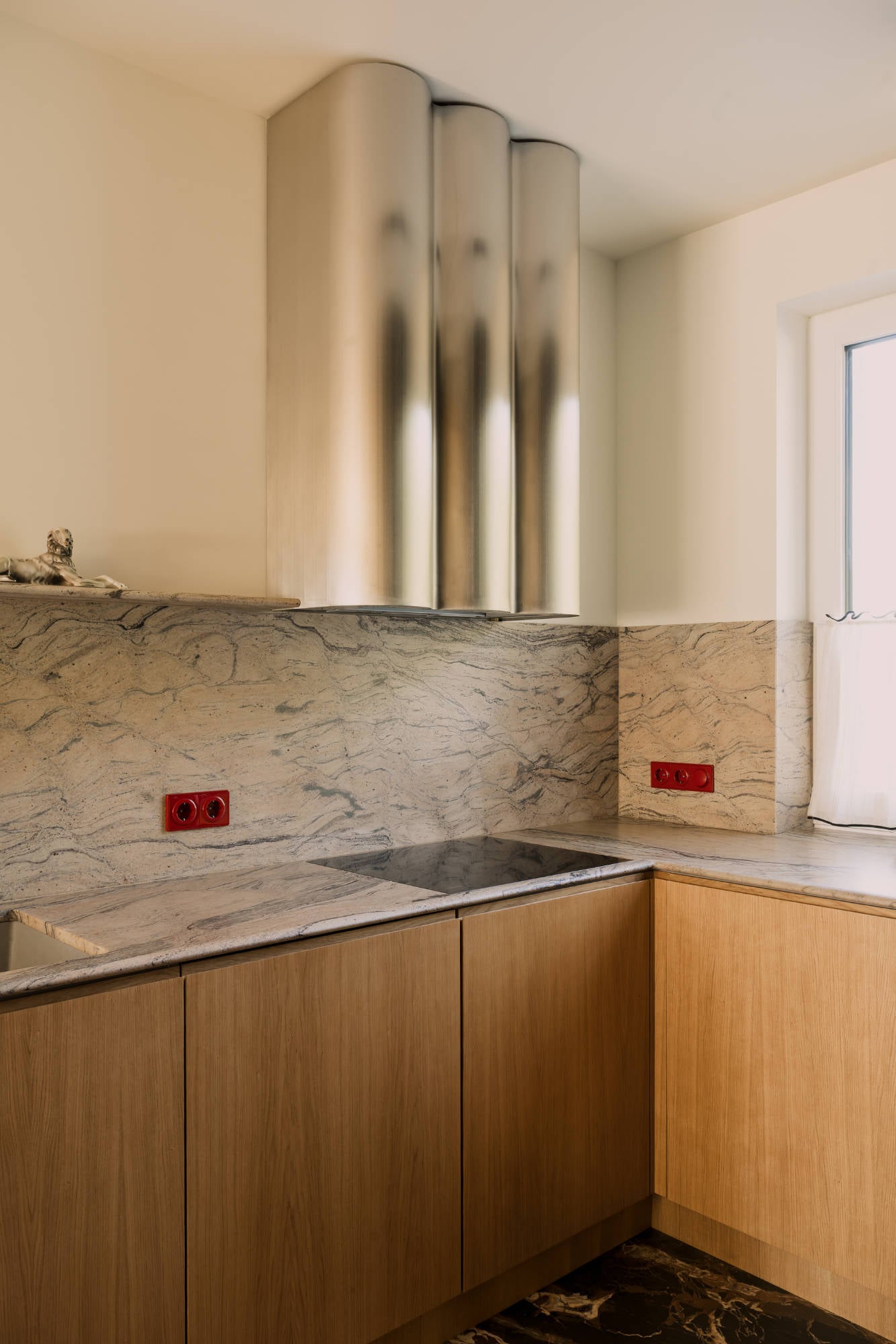 Damit aber noch nicht genug des Muts: Indem das Mistovia-Team dazu signalrote Steckdosen, Lichtschalter und Armaturen kombiniert, werden sonst unauffällige Bedienelemente bewusst als Kontraste inszeniert. Arbeitsplatte und Rückwand der Küche sowie ein Regal wurden in einem roséfarbenen Prada Gold Granit ausgeführt. Daran schließt eine Dunstabzugshaube an, deren Technik hinter zu Wellen gebogenen, matten Stahlblechen verborgen ist. Sie unterstreicht die Begeisterung aller Beteiligten für maßgeschneiderte Sonderlösungen mit geometrischen Qualitäten.