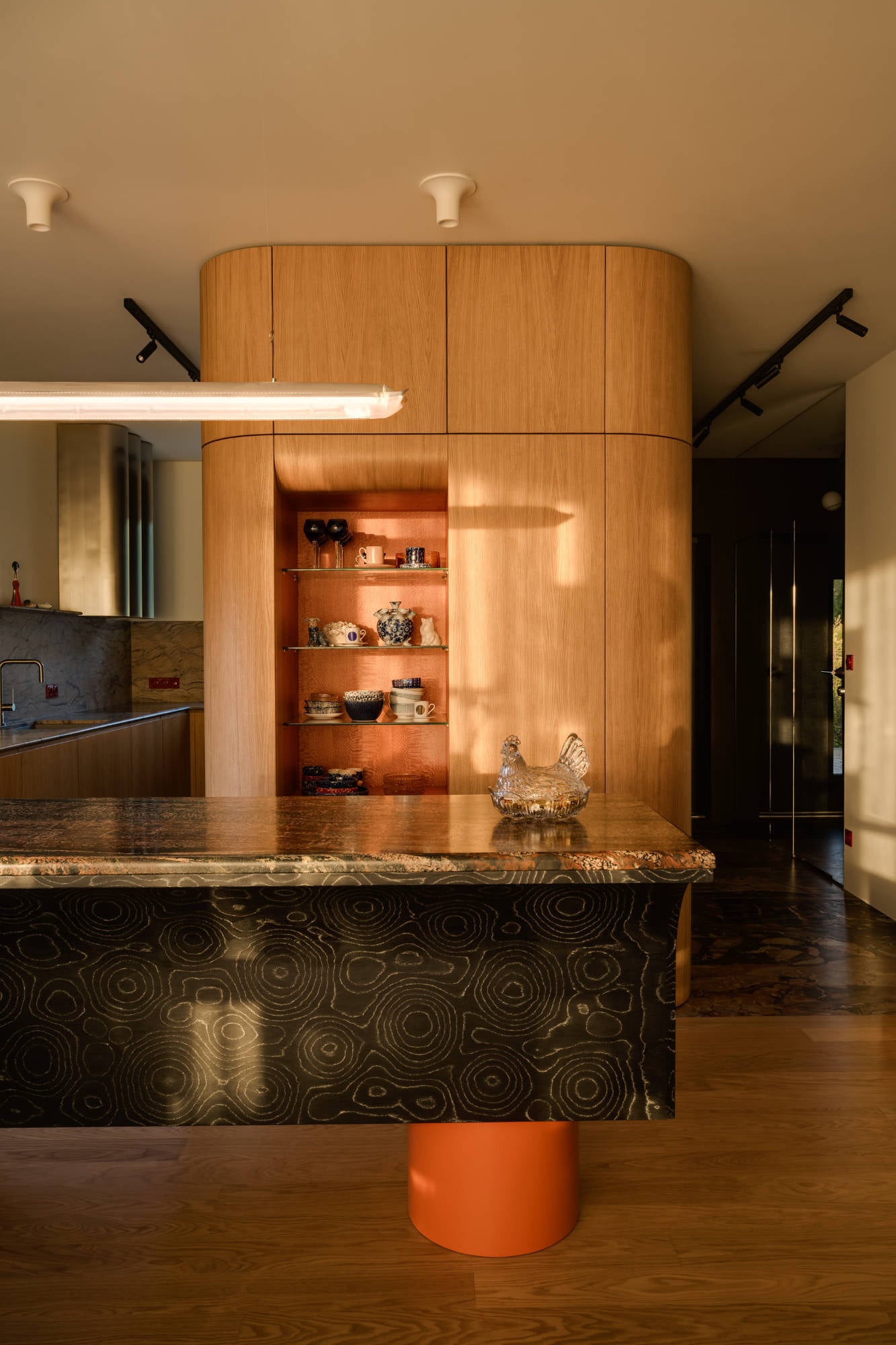 Das Obergeschoss präsentiert sich ruhiger und privater. Dort liegen Schlafzimmer, Atelier und Büro, die mit dunklen Möbeln, viel Textil und Holz sowie einer warmen Beleuchtung ausgestattet sind. Obwohl die Dynamik dieser Gesamtkomposition zwischen Piano und Crescendo variiert, ist durch das stringente Patchwork-Prinzip eine durchgängige Harmonie entstanden. „Alles hier hat sein eigenes Tempo, sein eigenes Licht. Die Formen sind unerwartet, mal weich und fließend, mal klar und geometrisch, wie ein Gespräch zwischen unterschiedlichen Persönlichkeiten, die dennoch harmonisch miteinander klingen“, sagt Marcin.
