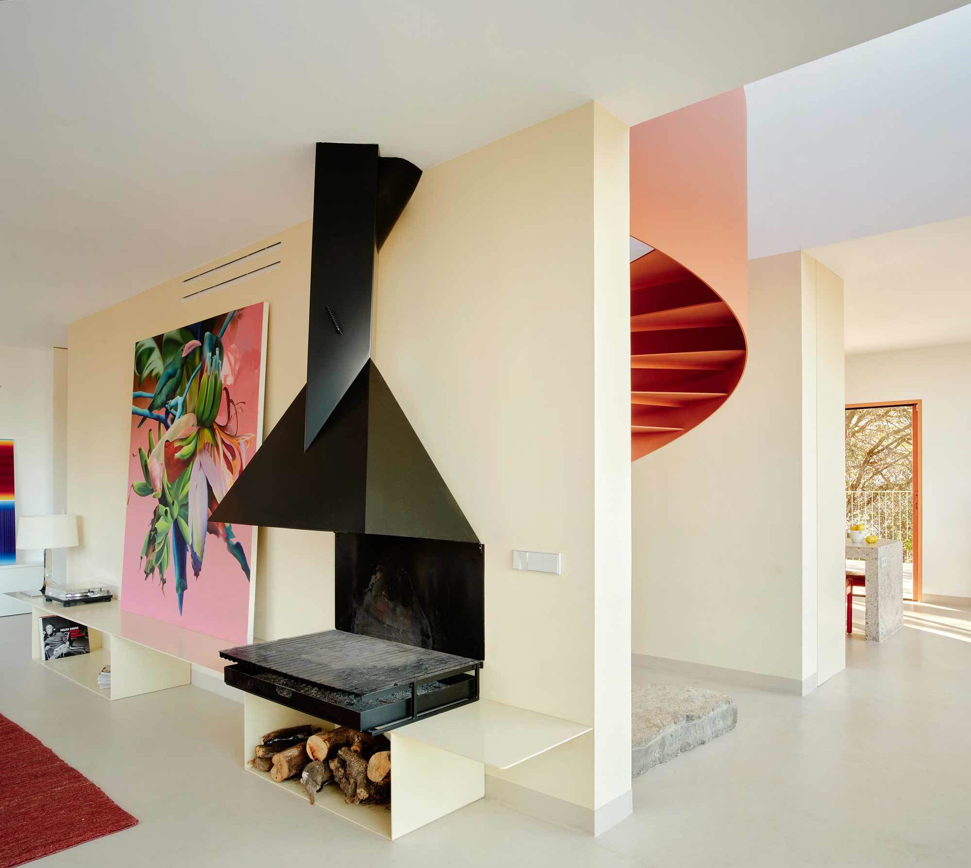 Luftig, weit und klar wirkt auch das Innere. Das liegt zum einen am Floating Space im Hauptgeschoss, der verschiedene Funktionen wie Kochen, Essen und Wohnen zusammenfasst und ein großzügiges Raumgefühl entstehen lässt. Ein veritabler Eyecatcher in der Küche ist ein großer maßgefertigter Esstisch aus Ortbeton und Ceppo-di-Gré-Gestein, der von einer raumhohen Küchenzeile umgeben ist. Während Wände, Böden und Decken im Wohnbereich in neutralen Weißtönen gehalten sind, setzen Möbel, Leuchten und Kunstwerke teils farbstarke Akzente – darunter Entwürfe aus den Sechzigerjahren von Vico Magistretti (Cassina), Osvaldo Borsani (Tecno), Federico Correa & Alfonso Milá (Gres) und Joan Antoni Blanc (Tramo), aber auch zeitgenössische Stücke von Herstellern wie Vitra und Nanimarquina.