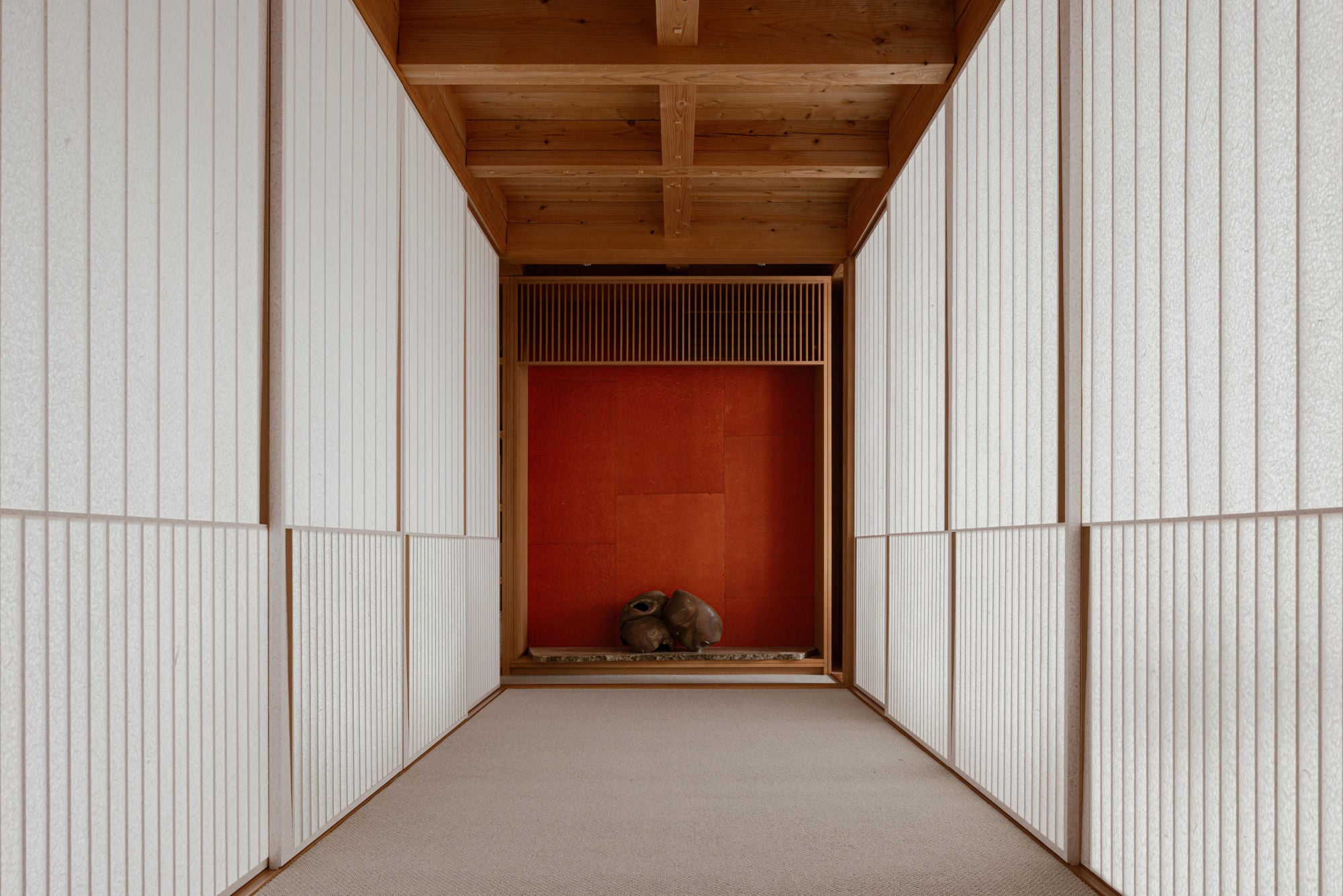 Zunächst öffnete das Team von Symbolplus die 67 Quadratmeter große Fläche auf zwei Etagen und baute die Räume auf ihr Holzskelett zurück. Anschließend wurde das neue Layout mit minimalinvasiven und materialehrlichen Lösungen umgesetzt. Einige der Außenwände sind jetzt verputzt, stehen mit einer farblich auf das Holz abgestimmten Nuance aber im Einklang mit dem Bestand. Dafür nutzten die Handwerker*innen rote Erde aus der Präfektur Ishikawa, die in mehreren Schichten aufgetragen wurde.
