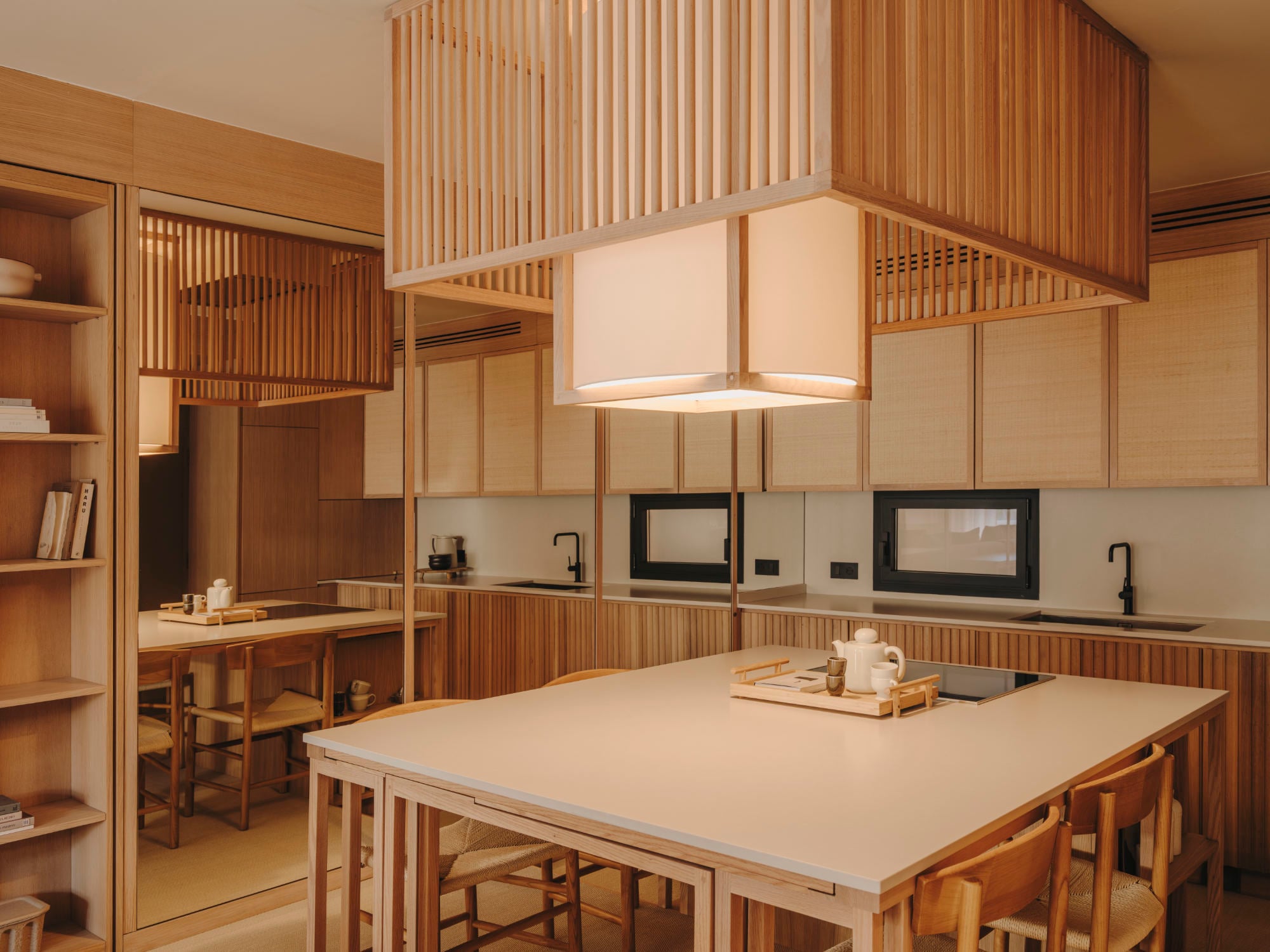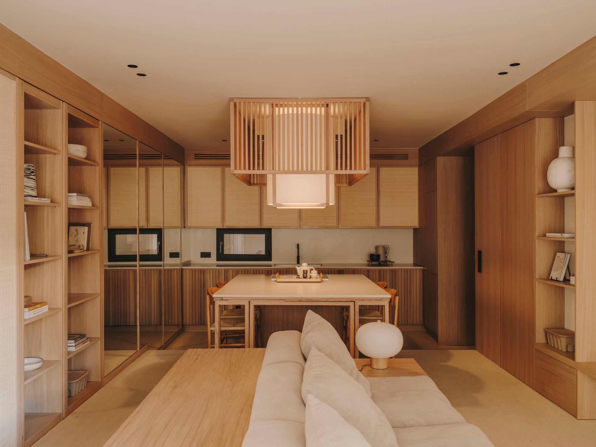 Durch ein kompaktes Layout, überraschende Flexibilität und warme Materialität vereint die Interiordesignerin Miriam Barrio in einer Wohnung in Barcelona japanische Kanso-Ästhetik mit mediterranem Flair. Dabei verzichtet sie konsequent auf Türen – und versteckt zwei Schlafzimmer hinter Raffiapaneelen.