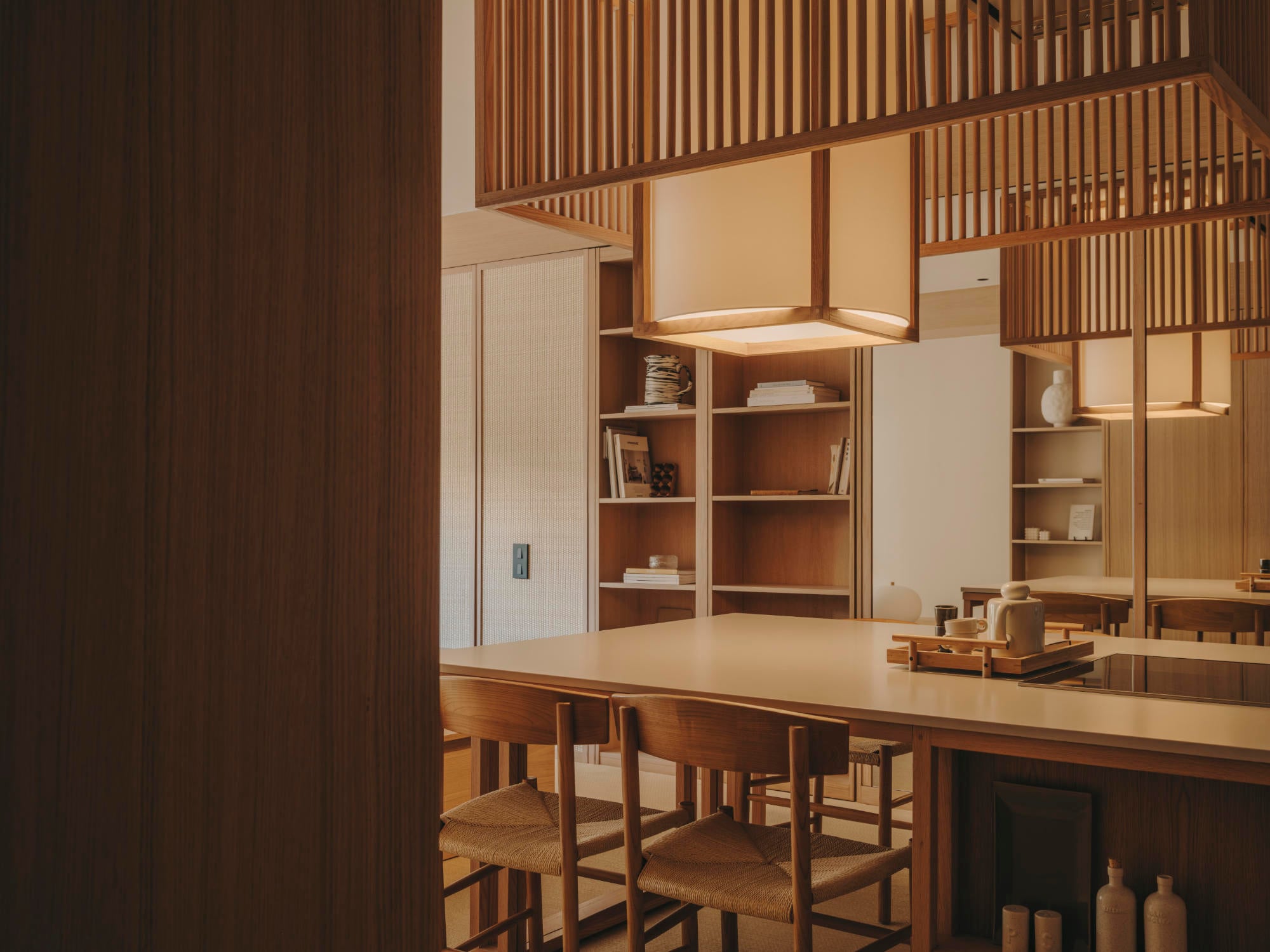 Erst auf den zweiten Blick wird deutlich, wie zentral die Lichtinszenierung für die Atmosphäre der Räume ist. Tagsüber ist die Gestaltung darauf ausgerichtet, möglichst viel natürliches Tageslicht zu nutzen, nach Sonnenuntergang erzeugen zahlreiche warme, indirekte Lichtquellen eine beinahe höhlenartige Stimmung. „Alles atmet Harmonie und Ausgewogenheit“, fasst die Designerin zusammen. In dem Apartment ist ihr die Verbindung japanischer Wohnkultur – geprägt von ruhiger Eleganz und Naturbezug – mit einer mediterranen Ästhetik gelungen. Letztere zeigt sich durch die Verwendung typisch spanischer Materialien wie Raffia und lokales Eichenholz. Es ist eine Architektur des Weglassens, die Geborgenheit erzeugt statt Leere.