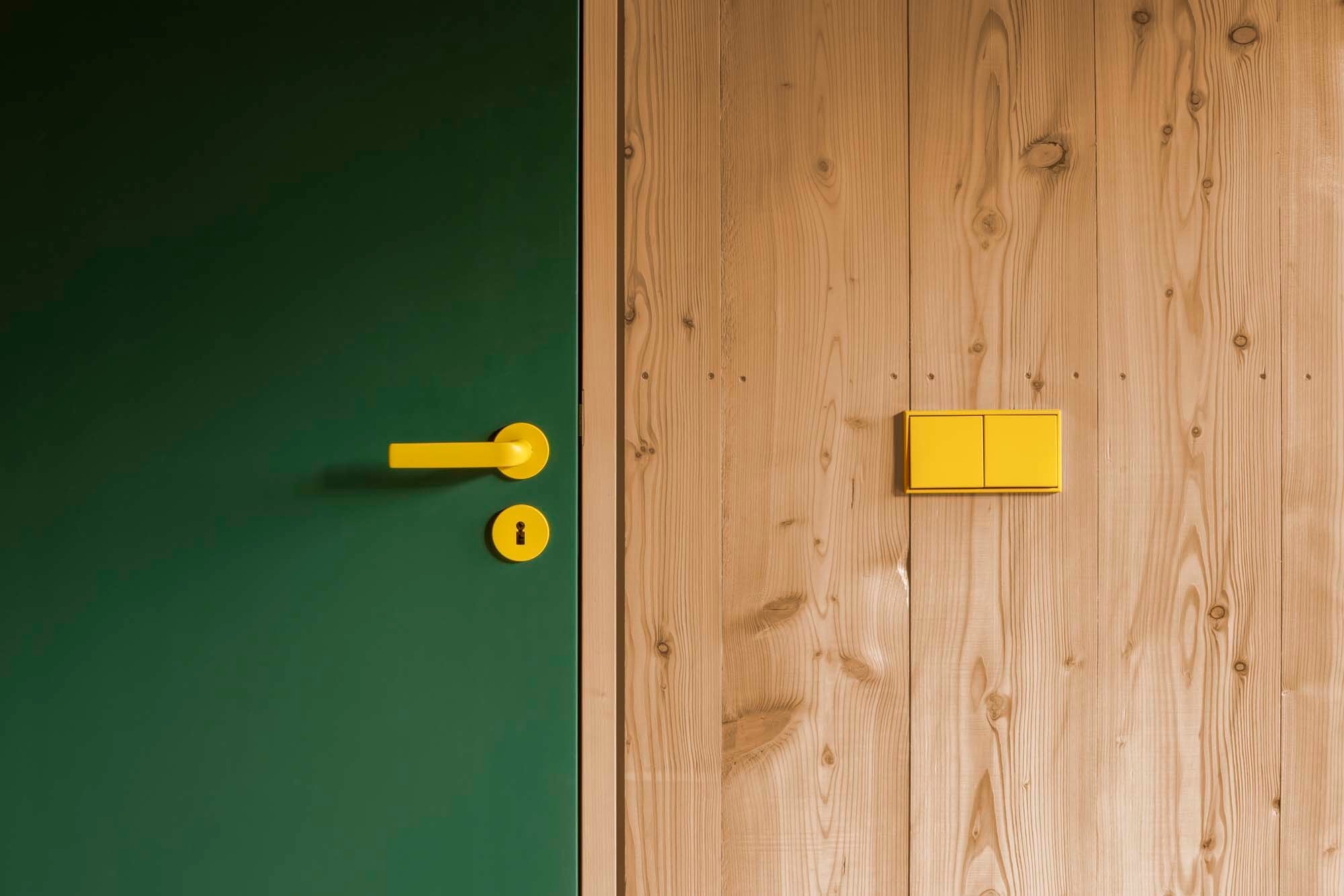 Auch im Inneren prägt Lärchenholz das Erscheinungsbild. Ergänzt wird es durch ein Farbkonzept auf Grundlage der Les Couleurs® Le Corbusier®-Palette. Kräftige Akzente in Dunkelgrün und Gelb markieren Türen, textile Vorhänge, Leuchten, Türdrücker sowie die Schalter und Steckdosen des Programms LS 990 Les Couleurs® Le Corbusier® von JUNG.