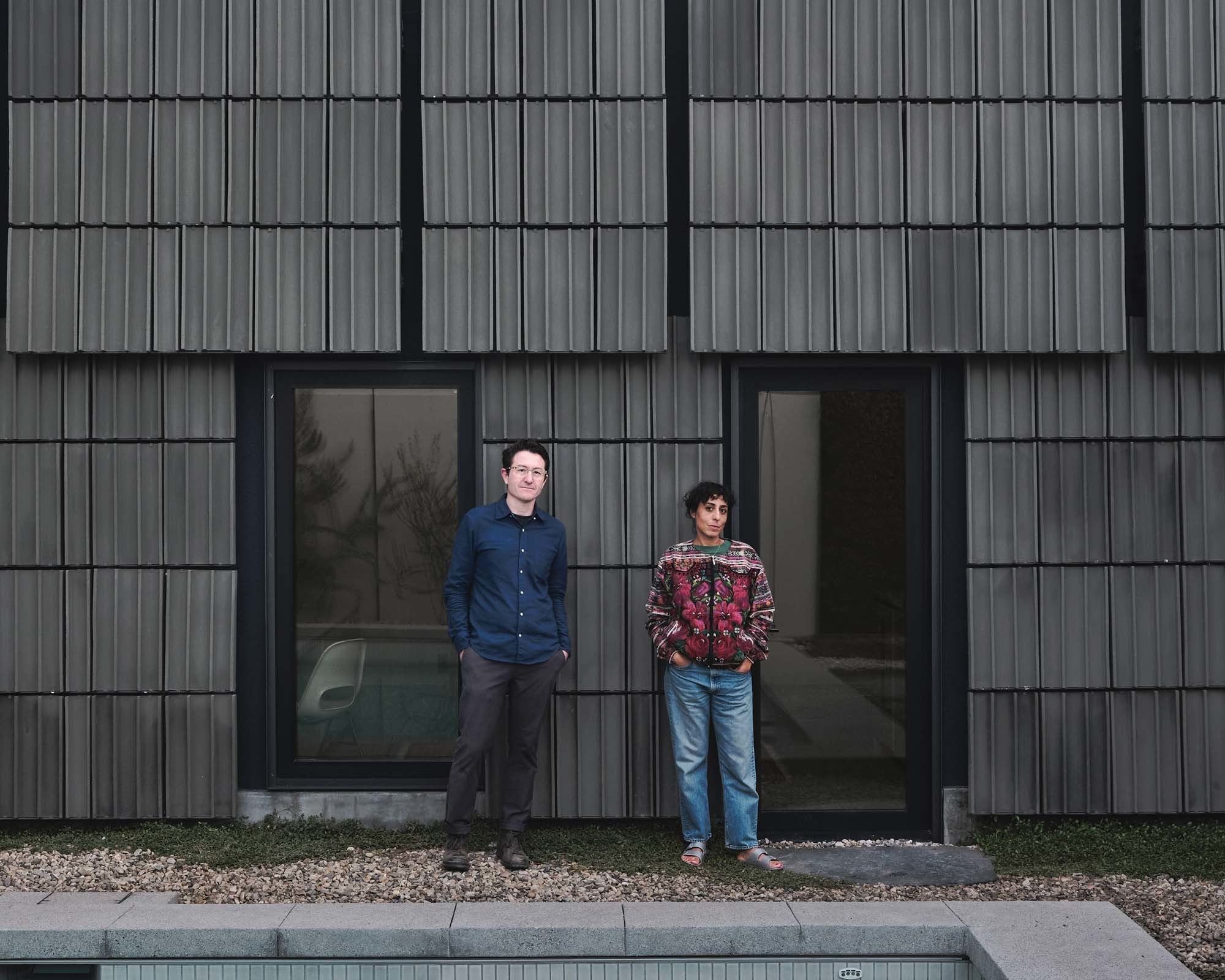 Das vorhandene Dach mit Terrakotta-Deckung diente als Inspiration für die Fassade des neuen Baus. Daraus leiteten die Architekt*innen ein Fassadenmodul ab, das in Kooperation mit Sandkuhl Clayworks, einem Hersteller von Tonbauteilen, weiterentwickelt und produziert wurde. Terracotta House ist nicht die erste Bauaufgabe, bei der Au und Henry das Projekt zum Anlass für eine eingehende Materialstudie nehmen. Sie verfügen über umfangreiche Erfahrungen in der Entwicklung neuer Oberflächen; zu den bisher im Rahmen ihrer Bauprojekte erforschten Materialien zählen unter anderem Betonzuschlag und Keramikguss. Für den Anbau in Leimert Park entstand eine neue Fliese, indem ein Standard-Terrakotta-Hohlblockstein mit drei Kammern unmittelbar nach dem Extrudieren und noch im feuchten Zustand mittig mit Draht geschnitten wurde. Das Ergebnis ist eine Toneinheit mit markanten vertikalen Rippen auf der einen Seite und einer flachen Oberfläche auf der anderen. Nach dem Brennen wurden die Fliesen im eigenen Werkstattatelier von Au und Henry mit einem tiefgrünen Pigment beschichtet.