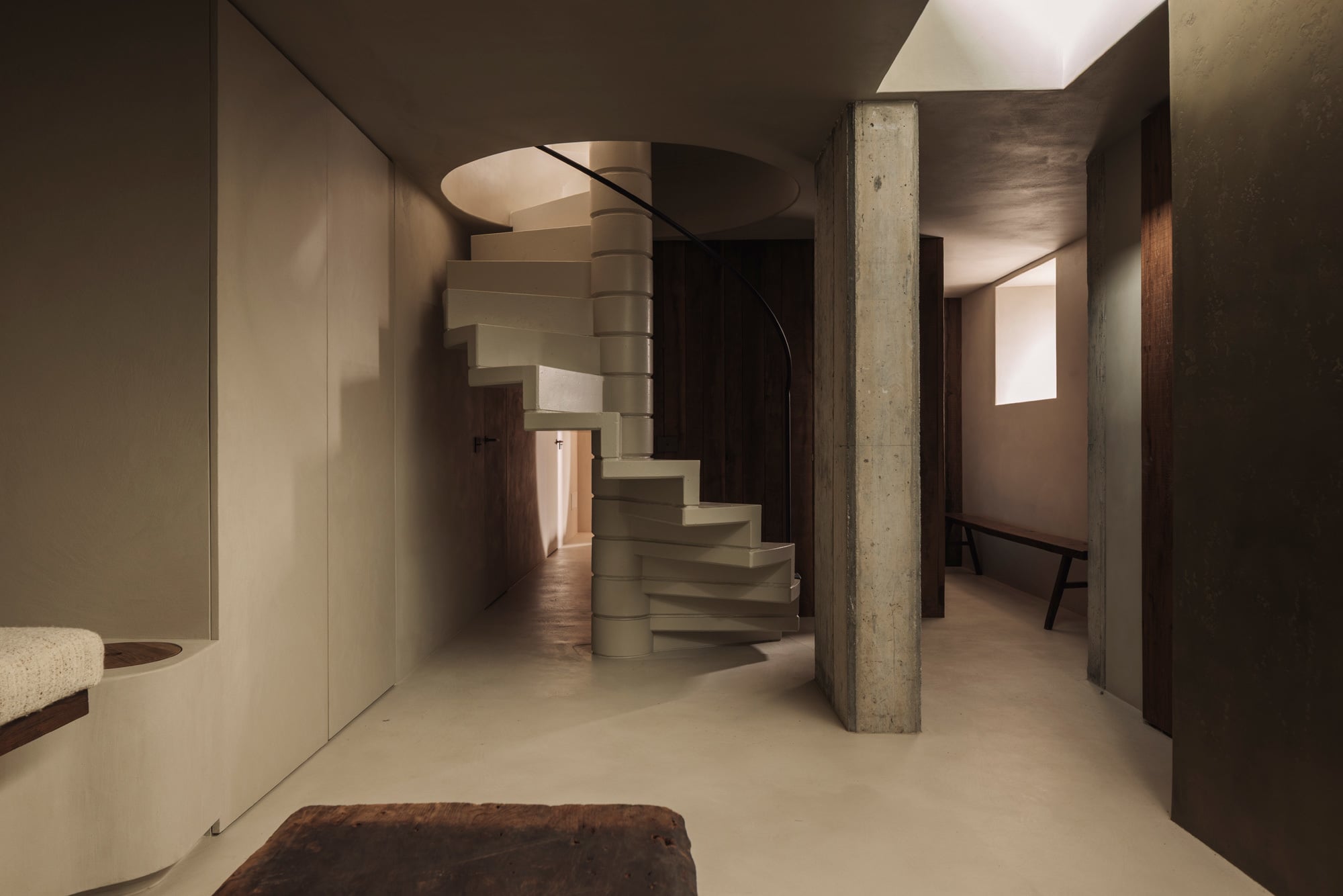 Über drei Etagen erstreckt sich das Ferienhaus mit seinen offenen Räumen. Entlang der Außenmauern verlaufen eingebaute Bänke mit Platz für Stauraum, die Mitte bleibt jeweils frei. Bezogen sind die auf Maß gefertigten Bänke mit Stoffen der belgischen Marke Bruder. In der Küche sind die Schränke aus lokalem Holz gefertigt, die Geschirrkollektion entwarf das Team von Maison Osaïn speziell für das Chalet. Mit der unaufgeregten Schlichtheit der Farben und Materialien möchten Butaye und Verschuren eine innere Ruhe evozieren, die, wie sie sagen, nicht durch Reduktion, sondern durch Ausgewogenheit entsteht. „Jedes Material birgt eine bestimmte Energie in sich, die Rauheit von Beton, die Wärme von Holz, die Kühle von Stein, und wenn sie in Harmonie zueinander stehen, beginnt der Raum zu atmen“, erklärt Ann Butaye. Die Gestalter*innen haben mit einer sehr zurückhaltenden Farbpalette gearbeitet, die den Geist zur Ruhe kommen lässt. Nichts drängt sich auf im House Montagna.