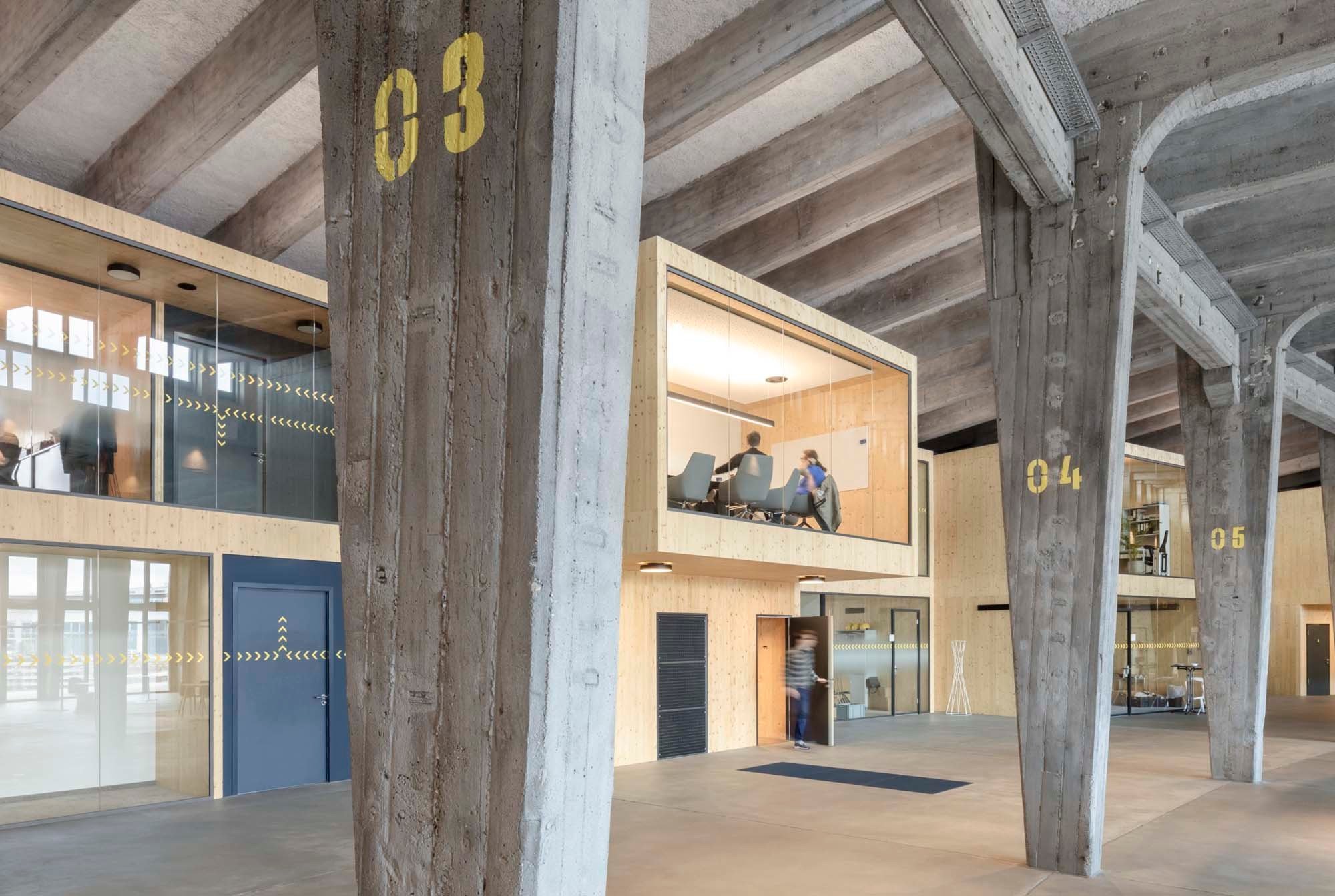 Die Leitidee des Entwurfs von Kresings besteht darin, die historischen Lokstände in ihrer Struktur weitgehend unangetastet zu lassen und die für das Innovation Centre notwendigen Räumlichkeiten als hölzerne Kuben in den alten Lokschuppen hineinzustellen. Diese in Massivholz ausgeführten, zweistöckigen Einbauten nehmen nun die ehemaligen Standplätze der Lokomotiven ein. Sie halten respektvoll Abstand zu dem als Betonkonstruktion ausgeführten Bestand und vermitteln deutlich den Eindruck des Nachträglichen, Hinzugefügten. So konnte der imposante Raumeindruck, der durch die acht Meter hohen Decken, die Oberlichtfenster und den „Wald“ aus Betonstützen entsteht, bewahrt werden. Der Ursprung des Gebäudes als Eisenbahnbau vermittelt sich weiterhin und verleiht den neuen Büro- und Gewerbeflächen einen unverwechselbaren Charakter.