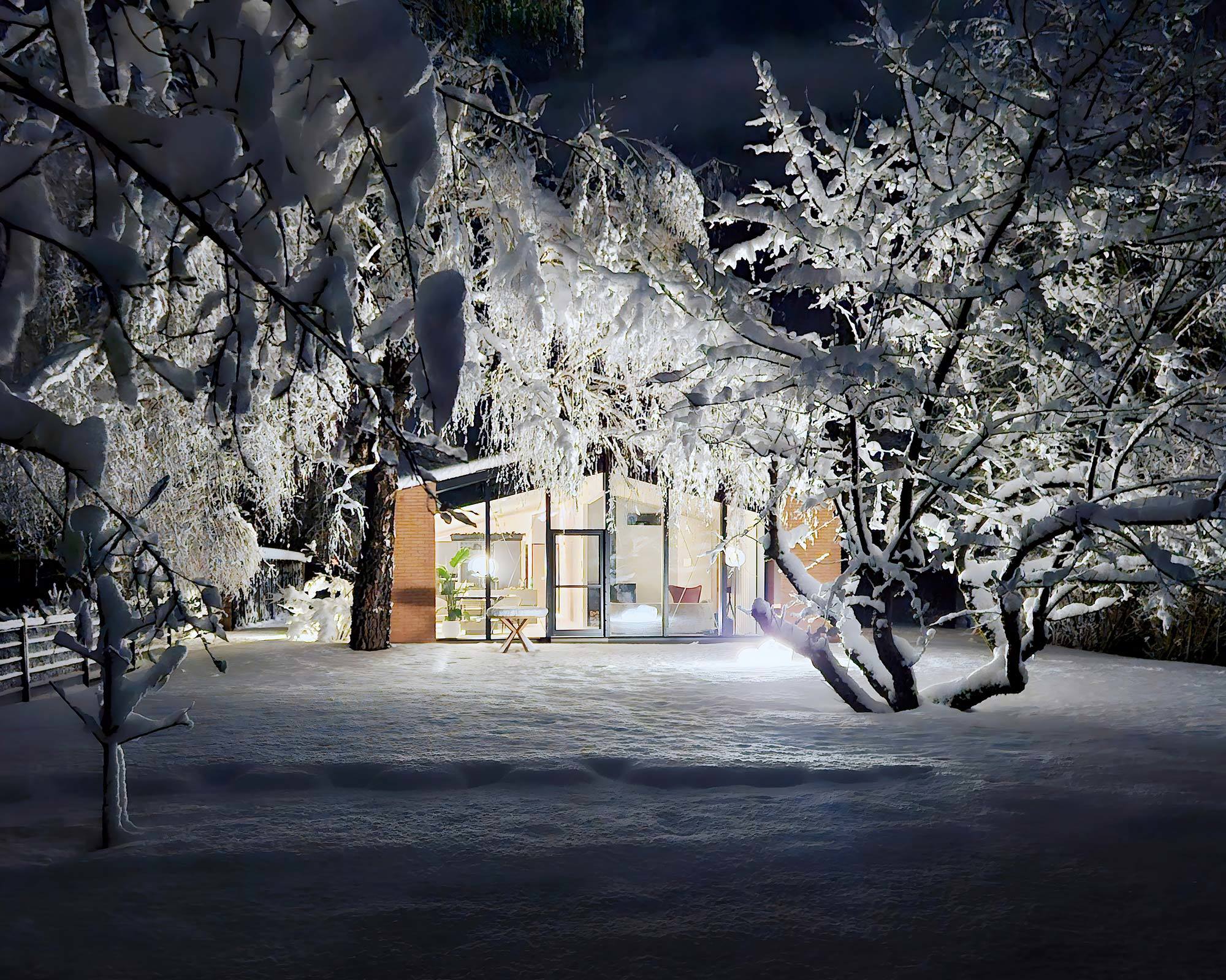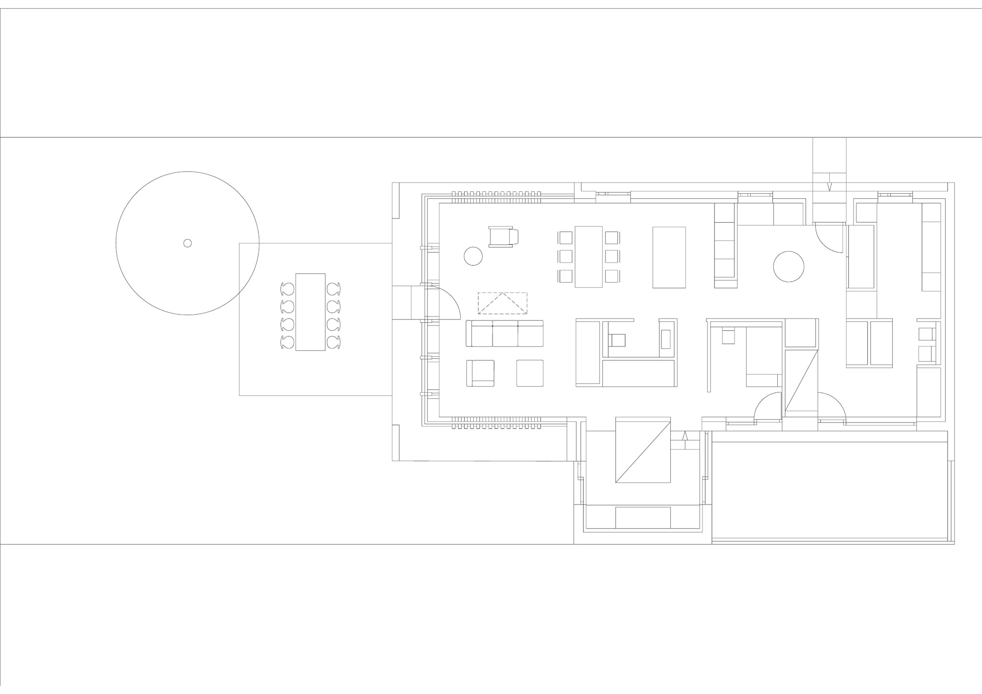 Der große Wohnraum erhält durch die mit Holz verkleidete Decke eine warme Atmosphäre und unterstreicht die skandinavischen Einflüsse. Ein großer Kamin spendet Wärme. Der in den Boden eingelassene Weinkeller ist durch eine transparente Scheibe mit dem Raum verbunden. Mit dem offenen Grundriss werden die Architekt*innen dem Bedürfnis der Bauherr*innen nach Gemeinschaft gerecht. Zwei Schlafzimmer mit Bad sowie ein kleines Arbeitszimmer bilden die Rückzugsbereiche des Hauses.