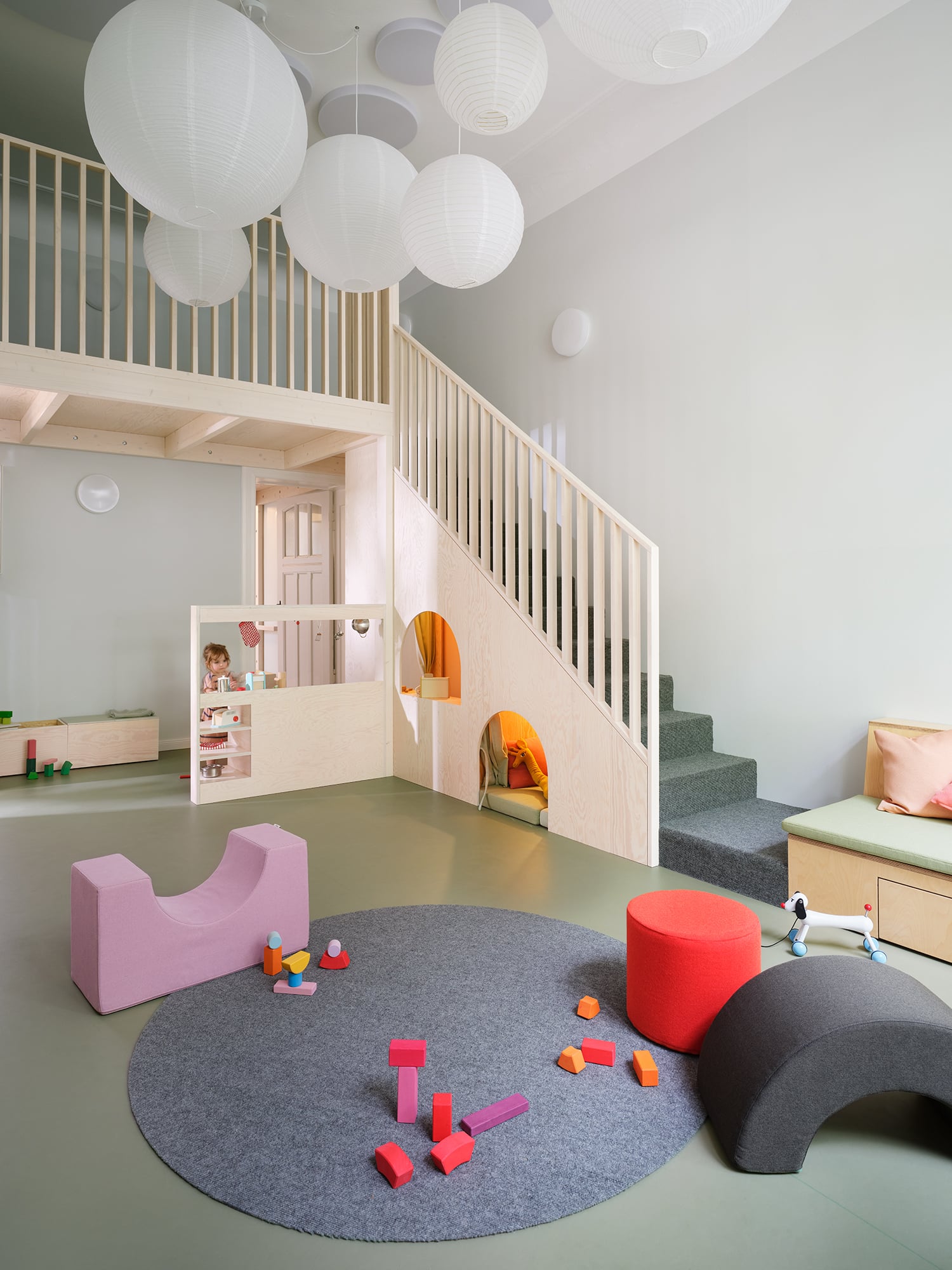 Auch der ursprüngliche Grundriss wurde komplett überarbeitet: Ein neuer Hauptraum mit Rückzugsbereichen, multifunktionalen Spielzonen und einer großzügigen Hochebene, die die Raumhöhe des Altbaus optimal ausnutzt, bildet nun das Zentrum der Kita. Darüber hinaus verlegte Studio Theobald das Badezimmer an die Fassadenseite, um erstmals eine natürliche Belichtung und Belüftung zu ermöglichen.