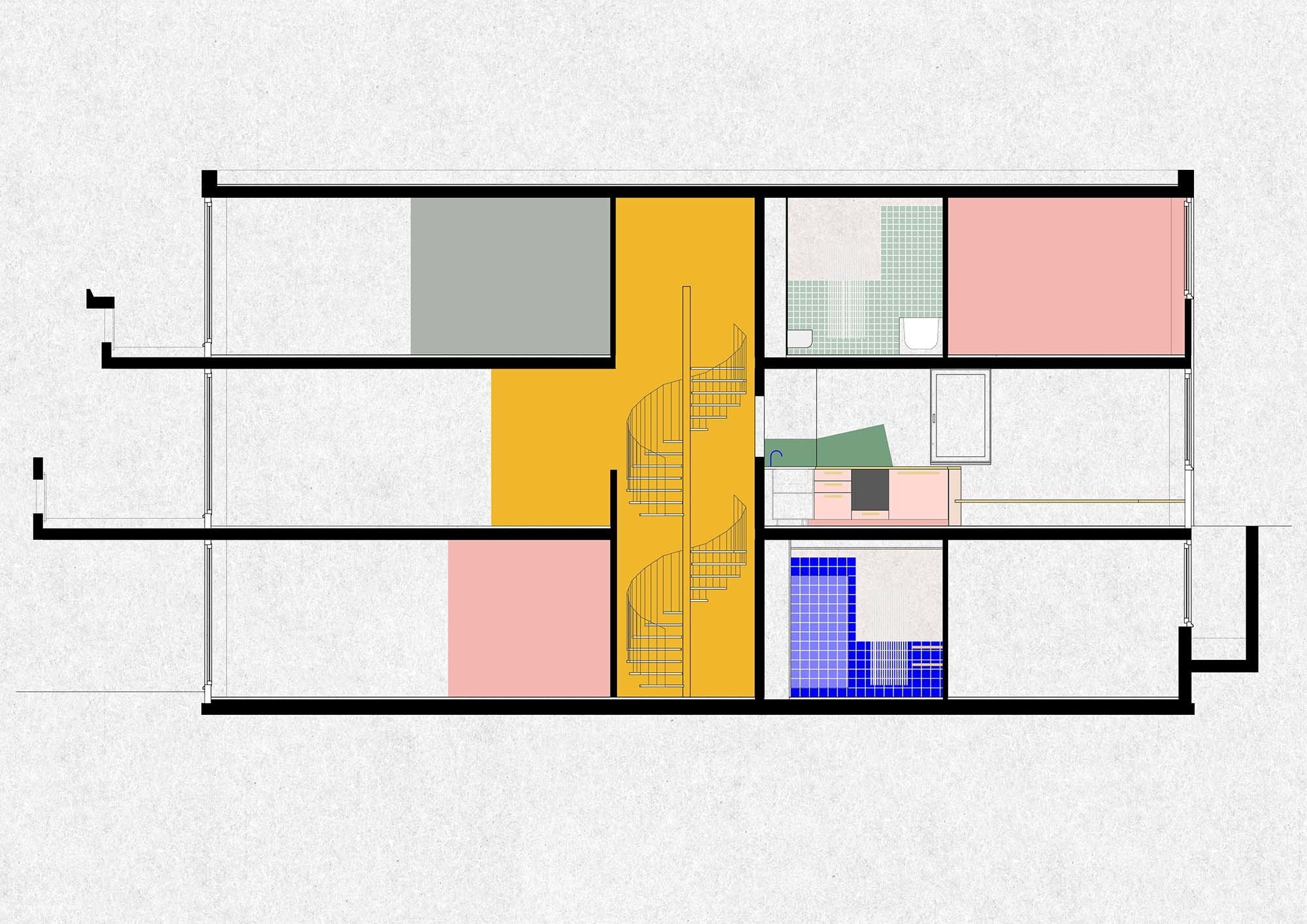 „Das räumliche Erlebnis wird durch die Gestaltung der Oberflächen bereichert“, so das Fazit der Architekt*innen. Und tatsächlich lebt das Projekt von dieser Balance aus einem respektvollen Umgang mit dem Bestand und Transformation: Räume, die einst eng und dunkel waren, öffnen sich heute zu farbenfrohen Wohnbereichen.