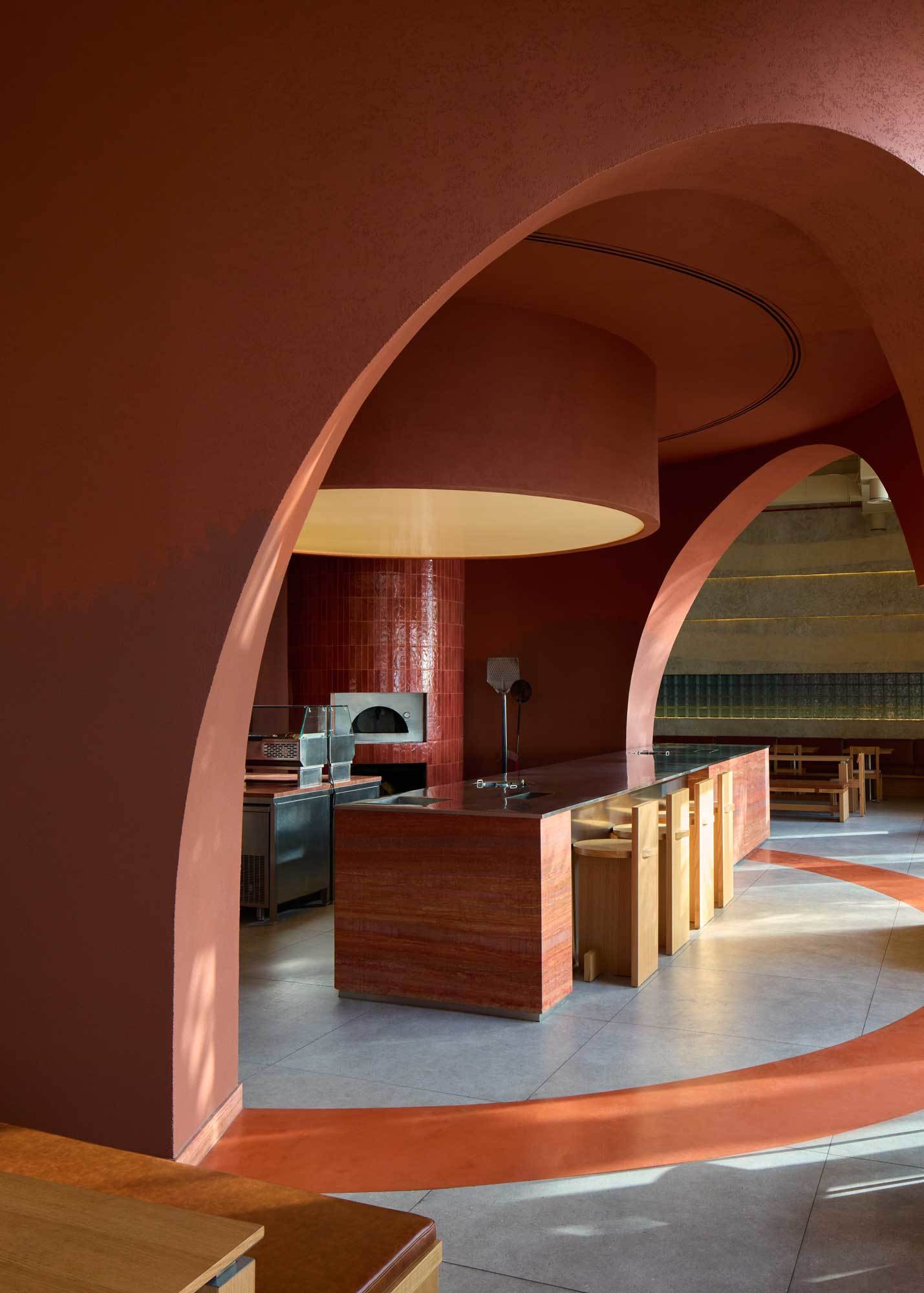 Das Restaurant verfügt über verschiedene Sitzbereiche und eine zentrale Servicezone mit Bartresen und gekachelten Pizzaöfen, die auf einer Fläche von 338 Quadratmetern untergebracht sind. Die Gestalter*innen spielen mit eingeschobenen Elementen, die den Raum zonieren und in ihrer Dreidimensionalität einen Eindruck von Bewegung hervorrufen. Dazu gehören Rundbögen, geschwungene, nicht ganz raumhohe Wände sowie Vorsprünge. Im Zusammenspiel mit dicken Samtvorhängen dienen sie als bühnenhafter Hintergrund für den Service- und Gastbereich.