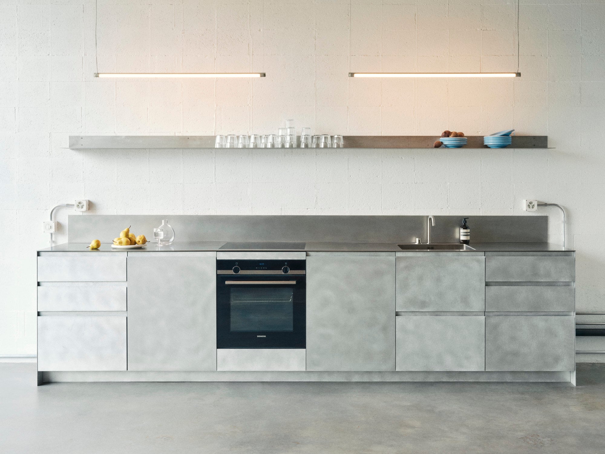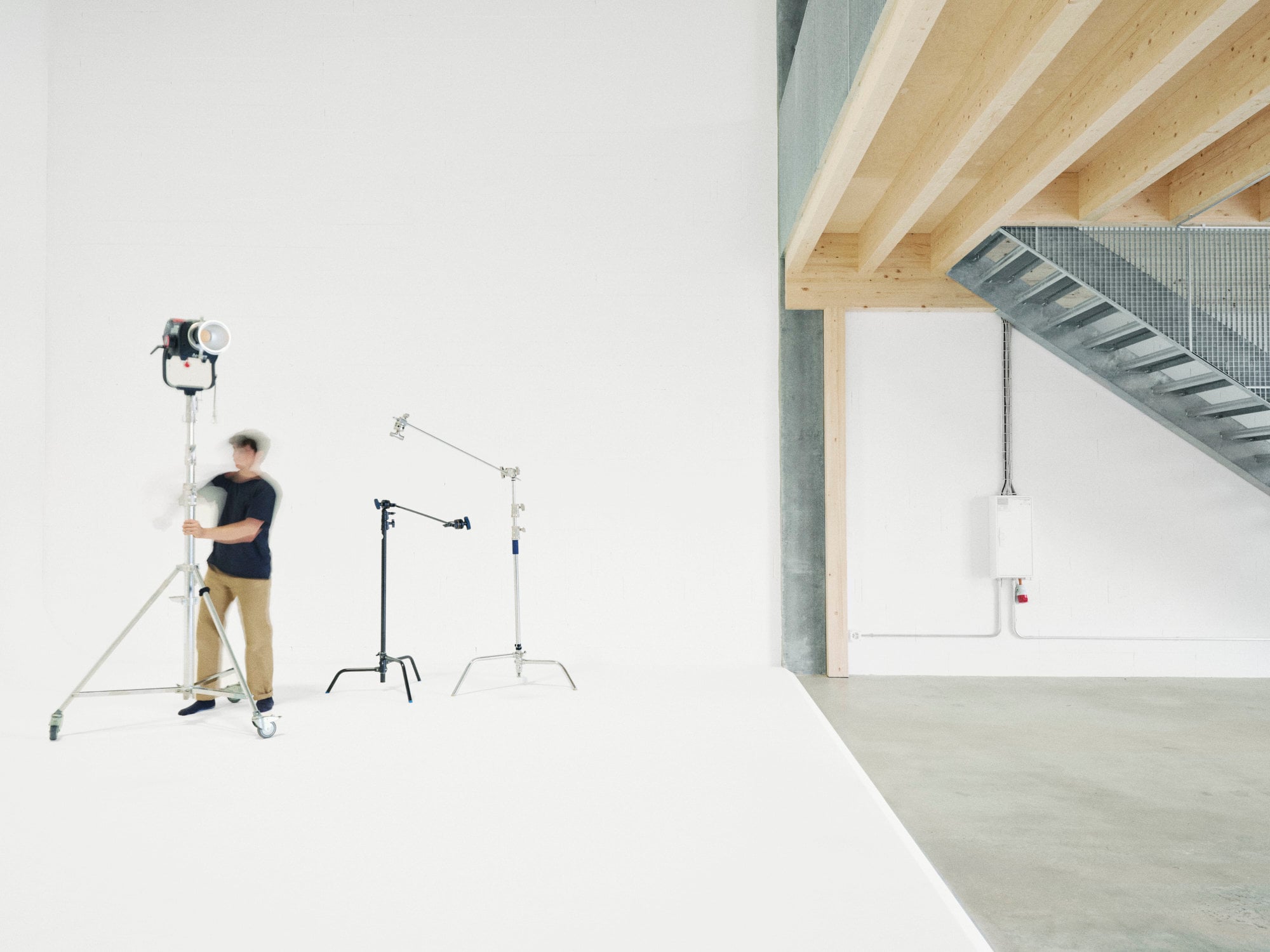 Im Erdgeschoss befinden sich die zentralen Studioflächen mit Cyclorama und einer funktional integrierten Küche. Die Galerieebene darüber nimmt Arbeitsplätze, Stylingbereiche sowie Rückzugsräume für Vorbereitung und Bürotätigkeiten auf. Diese vertikale Gliederung folgt weniger einem formalen Schema als vielmehr den Abläufen eines Fotostudios: konzentriertes Arbeiten oben, freie, wandelbare Produktion unten – verbunden durch kurze Wege und direkte Blickbeziehungen.