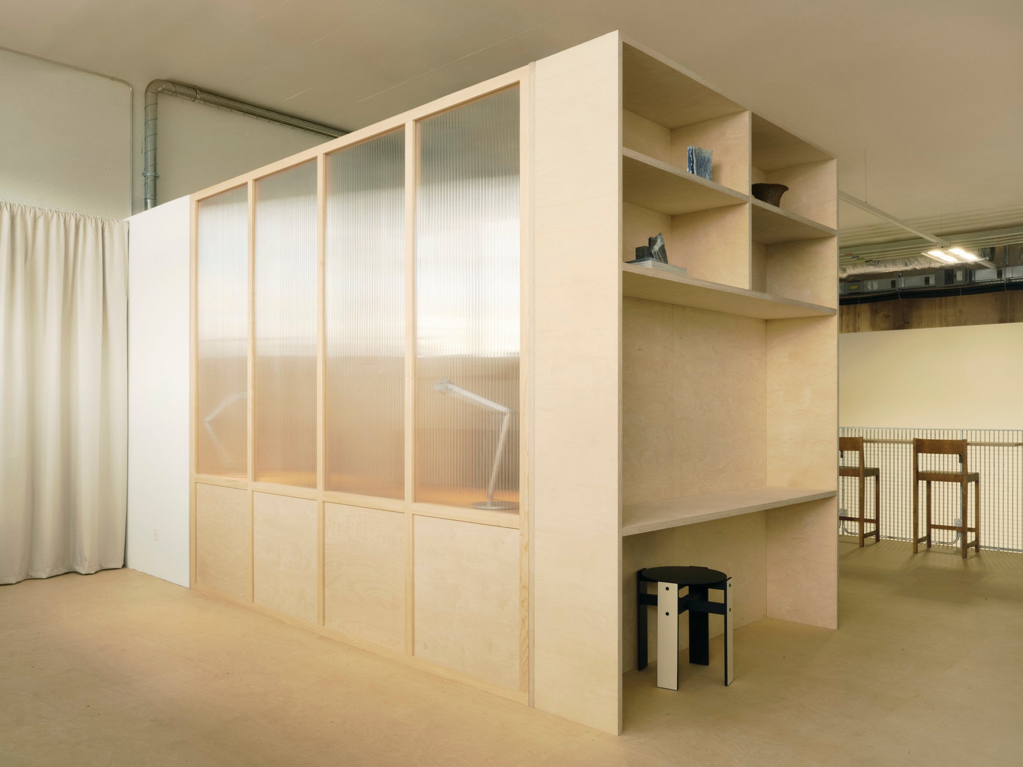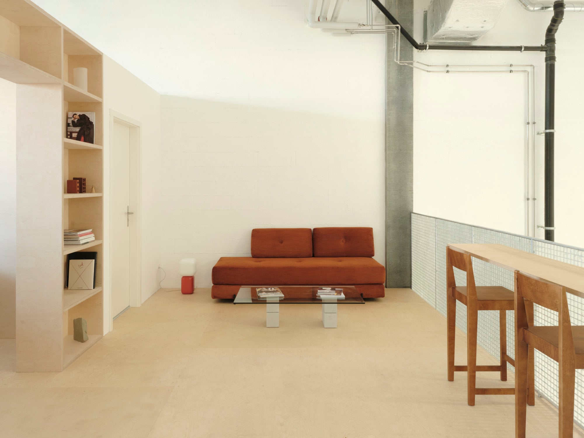 Dem industriellen Bestand haben die Architekt*innen eine zweite Materialebene entgegengesetzt. Die Galerie ist aus Brettschichtholzträgern und Sperrholzplatten konstruiert, Materialien, die sich auch in den maßgefertigten Einbauten, Regalen und Arbeitsplätzen wiederfinden. Ihre helle, warme Anmutung bildet einen ruhigen Gegenpol zu Beton, Stahl und sichtbarer Haustechnik. Holz fungiert dort nicht als dekoratives Element, sondern als konstruktives und ordnendes Prinzip, das dem Raum Struktur und Maßstab verleiht.