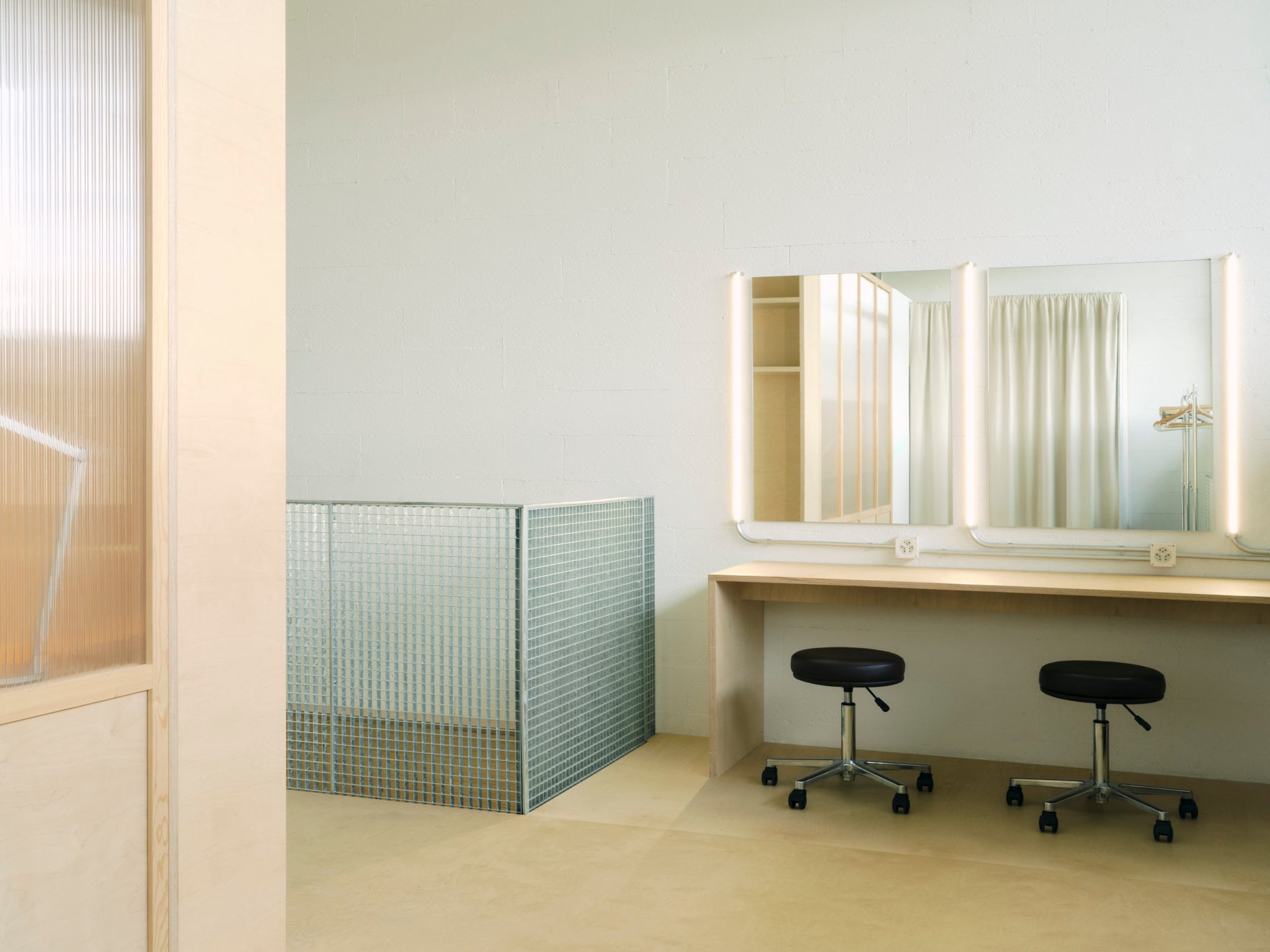 Auf der Galerieebene beschränkt sich der Eingriff nicht auf eine offene Plattform. Sapid Studio hat einen eigenständigen Raumkörper eingestellt, der die Ebene weiter differenziert. Leichte Holzwände fassen Arbeits- und Stylingbereiche zu klar definierten Zonen zusammen. Teilweise sind sie mit transluzenten Paneelen ausgeführt, die das Tageslicht filtern und zugleich visuelle Verbindungen aufrechterhalten. Ergänzt wird diese Struktur durch klappbare Tische entlang der Brüstungen, die flexibel als Arbeits- oder Aufenthaltsorte genutzt werden können.