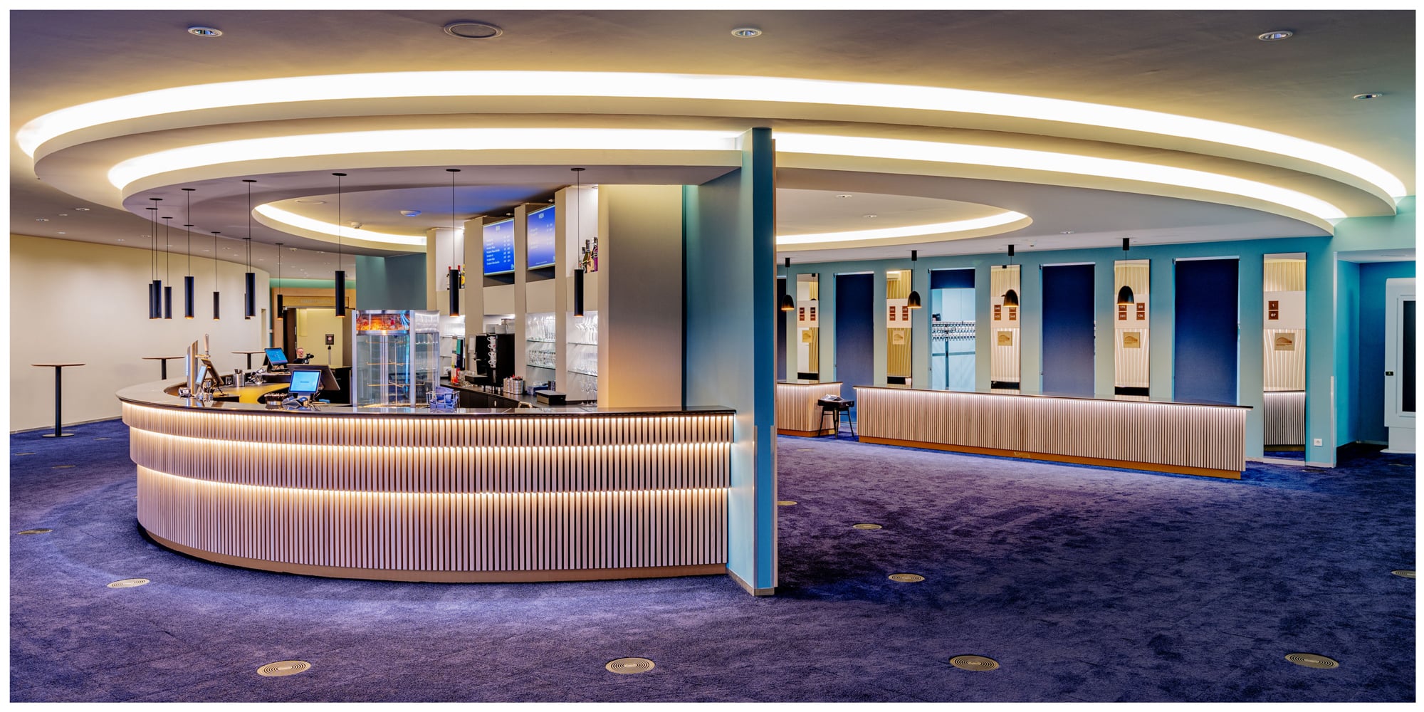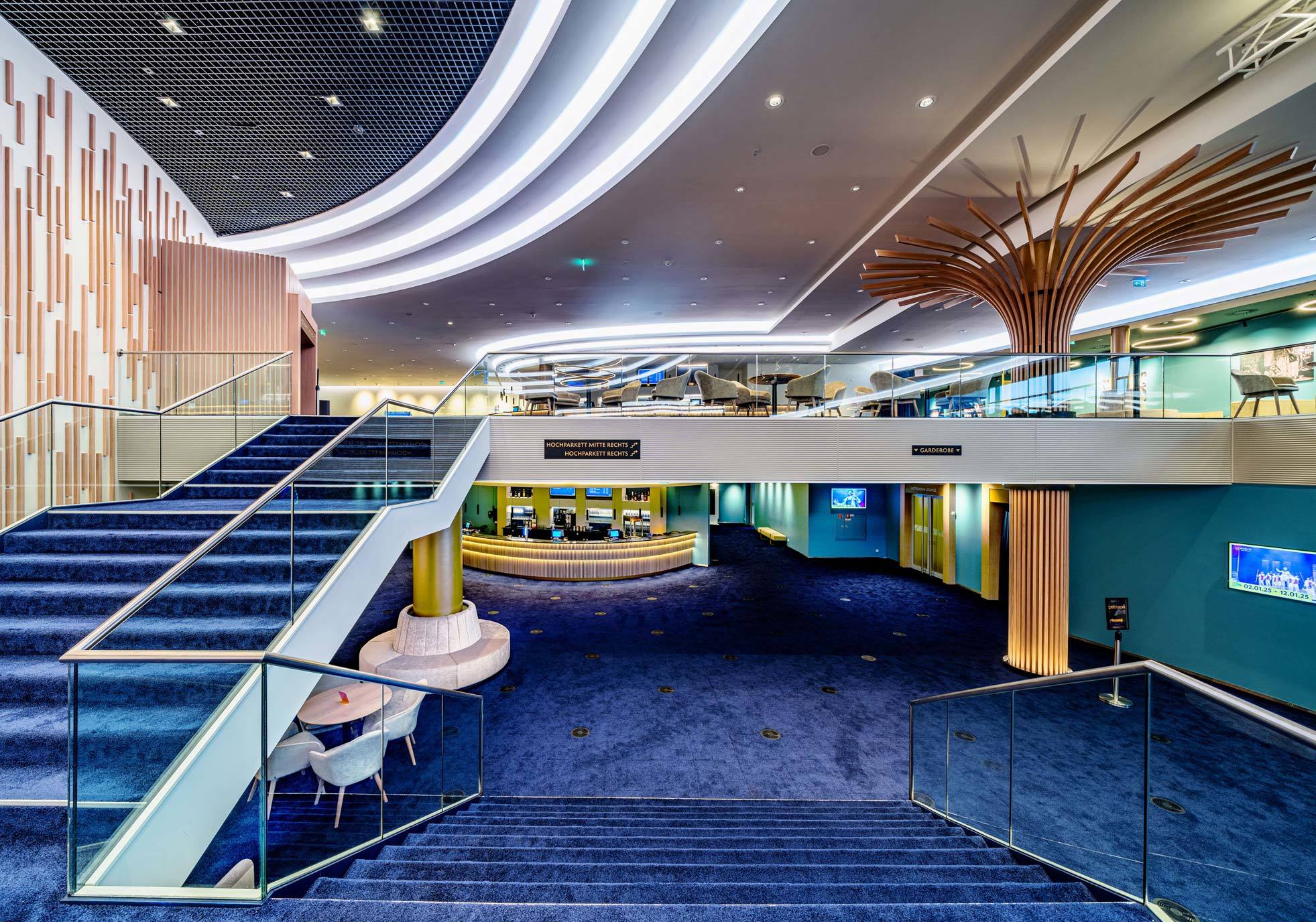 2024 übernahm Semmel Concerts das rund 1.700 Plätze umfassende Haus und engagierte das Lichtplanungsbüro ANDRES + PARTNER für den Umbau. Leuchten und Technik stammen von TRILUX. Mit dem Neustart erhielt das weiträumige Foyer eine Lichtarchitektur, die die vorhandenen Formen neu interpretiert. Der nachtblau schimmernde Teppich, die geschwungenen Treppenläufe und die imposanten Säulen mit Kapitellen wie abstrahierte Baumkronen bleiben zentrale Elemente, doch die neue Lichtführung verändert ihre Wirkung grundlegend. Geschwungene, umlaufende Voutenbänder geben dem Raum eine weiche Dynamik. Sie folgen den großformatigen Rundungen, markieren Übergänge und schaffen eine klare Hierarchie zwischen Bewegung, Aufenthalt und Orientierung.