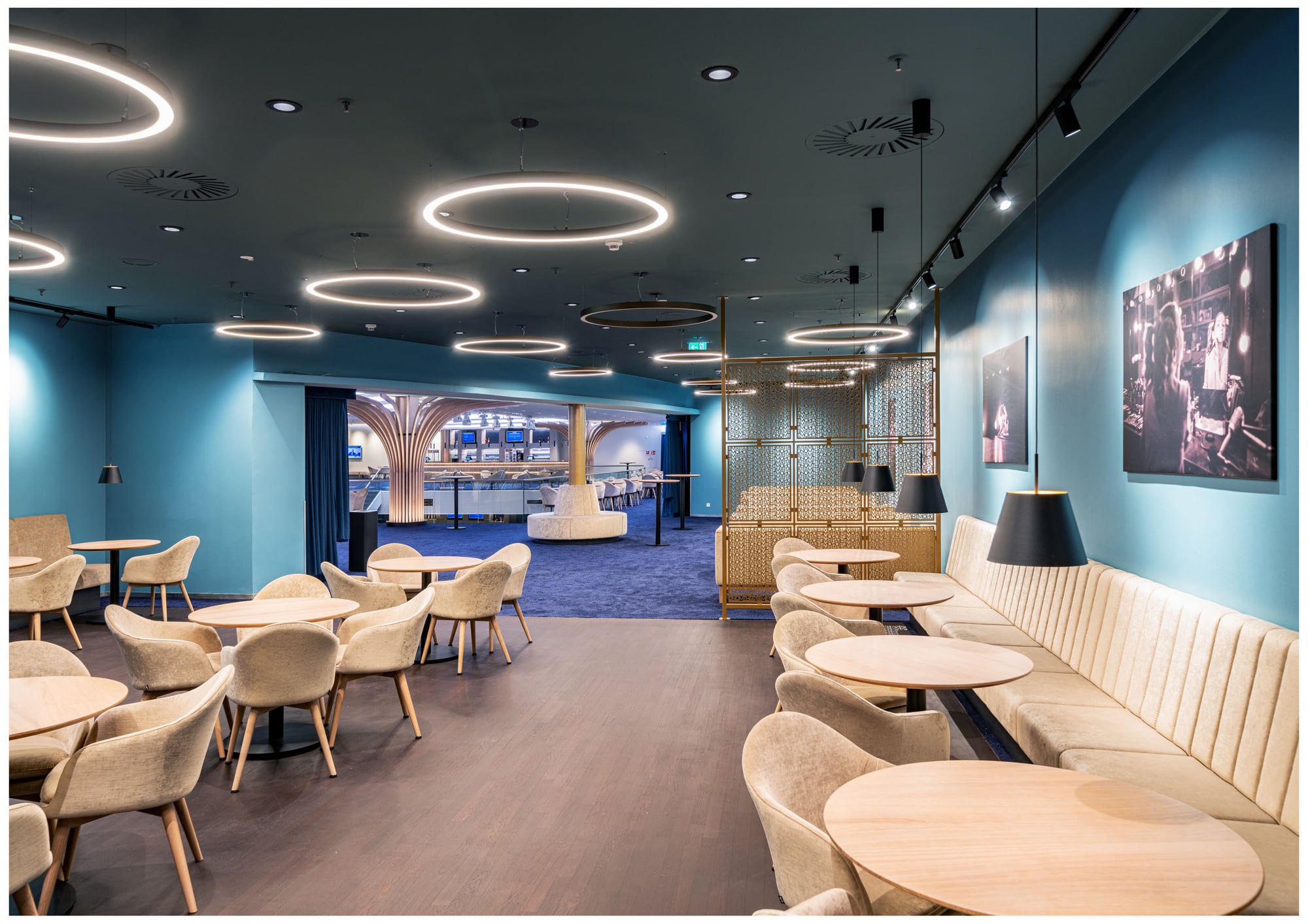 In anderen Aufenthaltsbereichen verdichten sich mehrere kreisförmige Leuchten zu einer re-gelrechten Deckenlandschaft. Die überlappenden Ringe wirken wie orbital angeordnete Elemente und geben den Sitzgruppen eine leichte, fast schwebende Charakteristik.