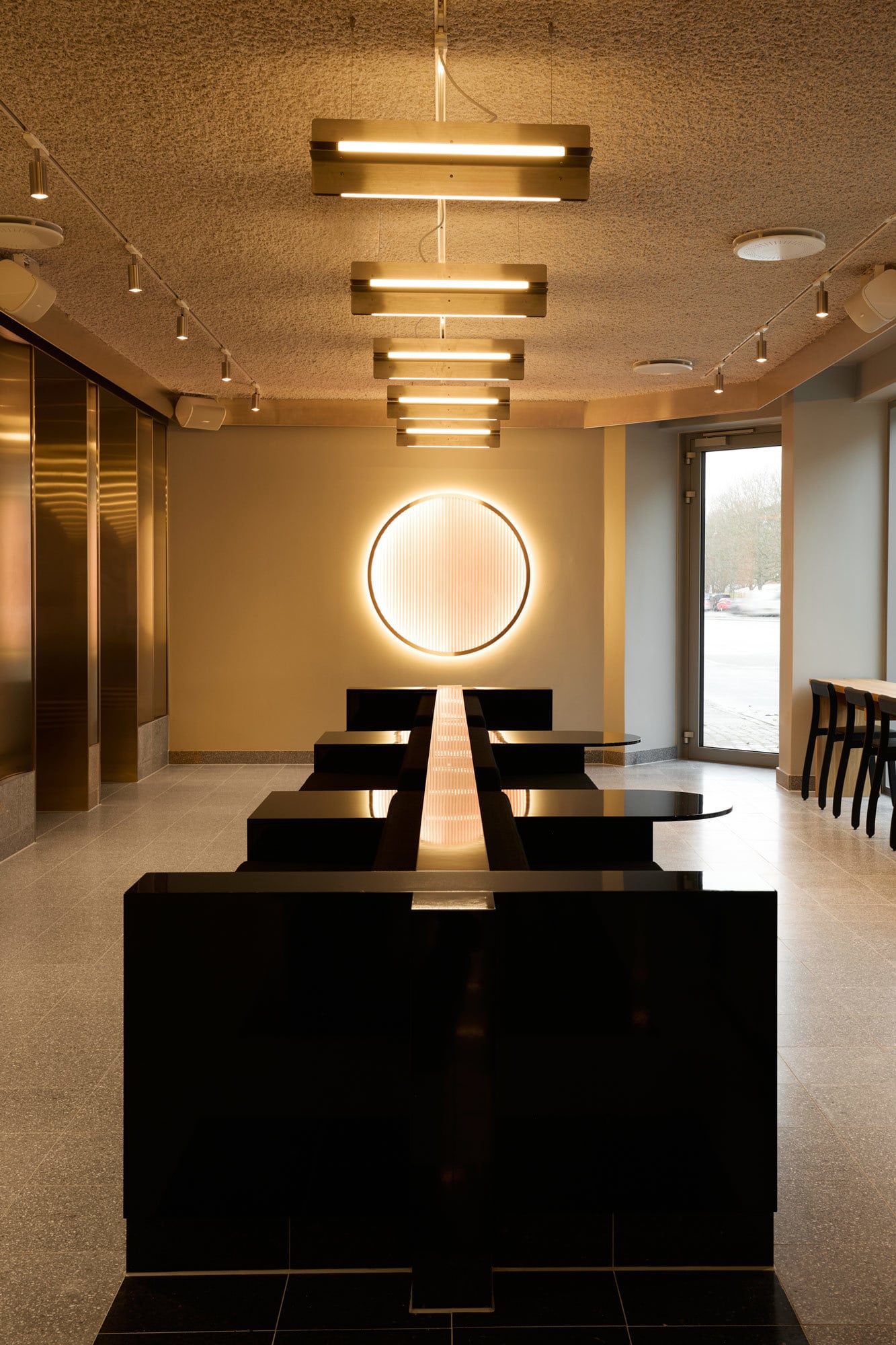 In der Lobby empfängt die Gäste ein skulpturales, von Norrøn Architects entworfenes und vor Ort gefertigtes Eichenmöbel mit schwarz glänzendem Lack. Es dient zugleich als Sofa, Tisch und zentraler Treffpunkt. Die Wirkung der reflektierenden Oberfläche verändert sich im Laufe des Tages mit den wechselnden Lichtverhältnissen. Darüber schwebt ein fünfstöckiger Kronleuchter, der wie eine vertikale Lichtsäule das Treppenhaus erhellt.