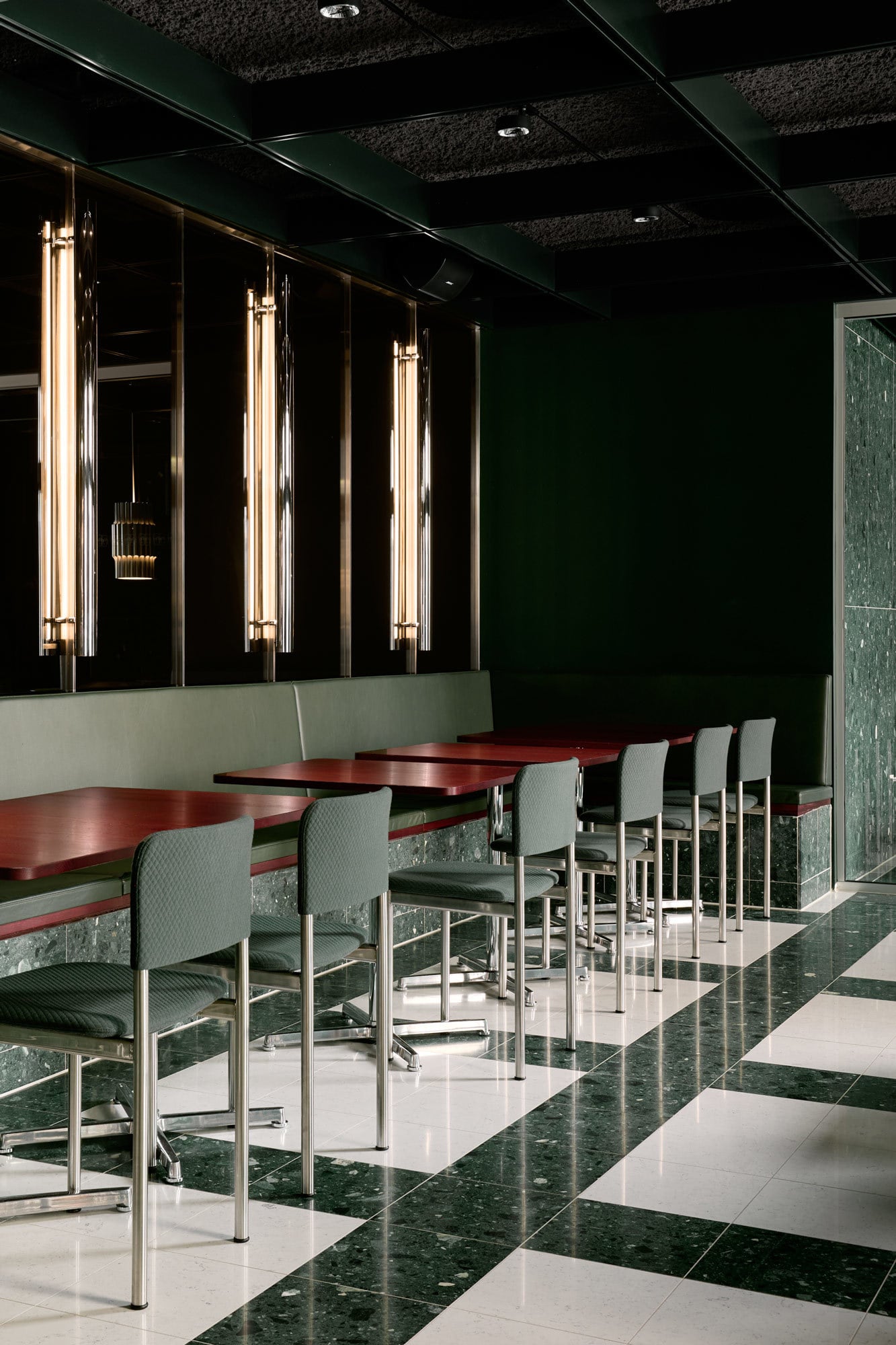 Den Frederiksberg-Teil prägt ein Interieur, das als Erweiterung des Innenhofs gedacht ist. Ein Bodenmuster aus grünem Terrazzo verbindet optisch den Innen- und Außenbereich des Hotels. Die tiefgrüne Kassettendecke schreibt dieses Farbkonzept fort. Durch die raumhohe Verglasung und die verspiegelten Wandpaneele fällt Tageslicht bis tief in die Räume.