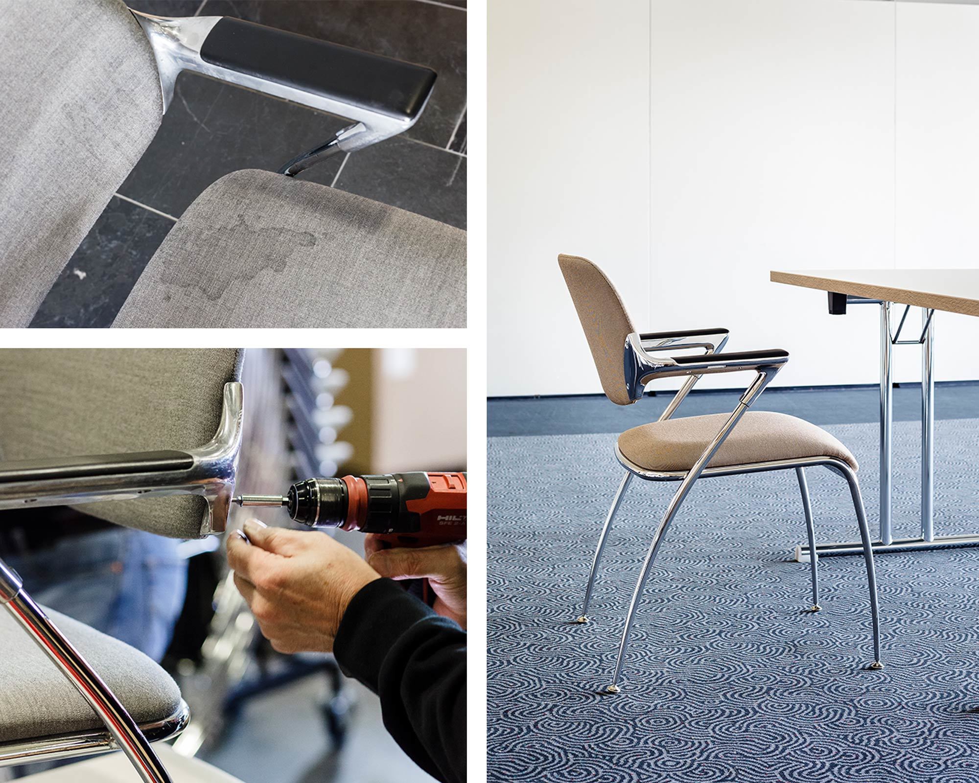 Wie dieser Ansatz funktioniert, zeigt das Dorint Hotel am Nürburgring. Dort wurden 590 golf-Stühle und 303 Tischplatten überarbeitet, Polster, Armauflagen und Gleiter erneuert. Obwohl die Modelle nicht mehr im aktuellen Portfolio sind, konnten sie problemlos überholt werden. So bleiben sie funktional, ästhetisch zeitgemäß und langfristig nutzbar.