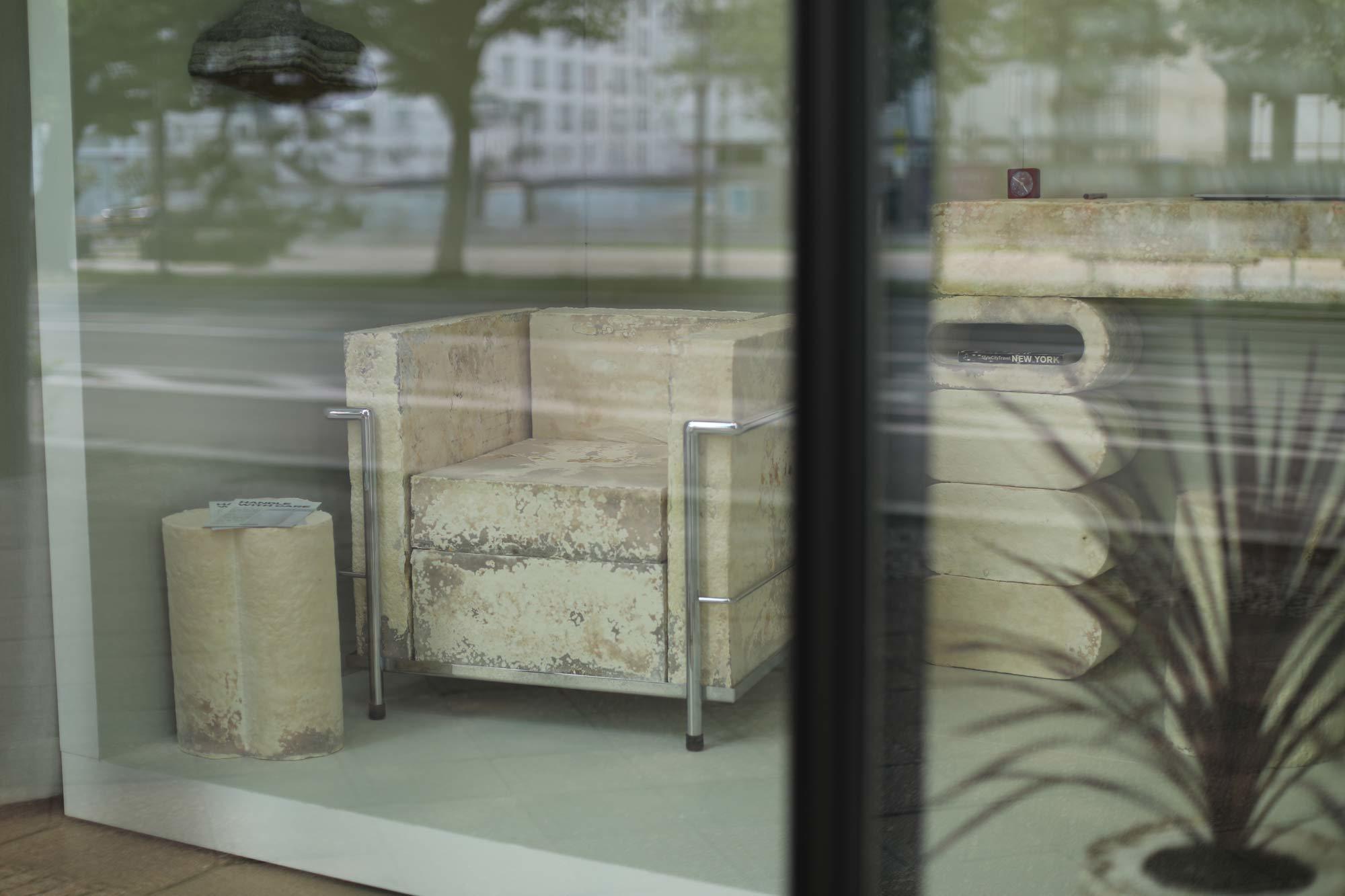 So entsteht ein leichter, stabiler, langlebiger und vollständig kompostierbarer Verbundstoff – mit angenehmem Geruch und vielseitigen Anwendungsmöglichkeiten. „Das Material kann verschiedene Härtegrade bekommen und hat eine ganz eigene Haptik – zwischen Camembert und Kork“, erklären Huber und Schmidt. Dabei ist die Produktion schon jetzt skalierbar: Kurze Wachstumszyklen und modulare Formen ermöglichen perspektivisch eine industrielle Fertigung. „Die Gestaltung eines Workspace im Fora Linden Palais oder die Neuinterpretation eines Corbusier-Sessels zeigen das Potenzial unseres Materials“, sagen die beiden Gestalter. „Mit 20 Schalungen pro Bauhaus-Sessel beispielsweise könnte man innerhalb von fünf Wochen 100 Sessel wachsen lassen.“